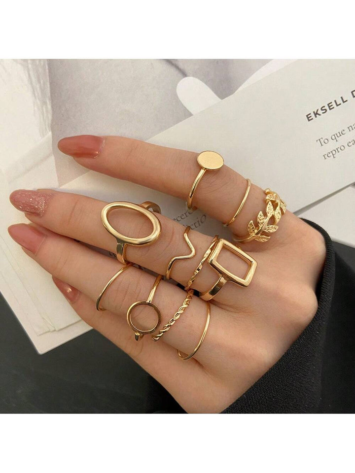 Shein - 11pcs/set Gold-color Geometric Leaf Creative Design Ring Set, Suitable For Women's Daily Wear