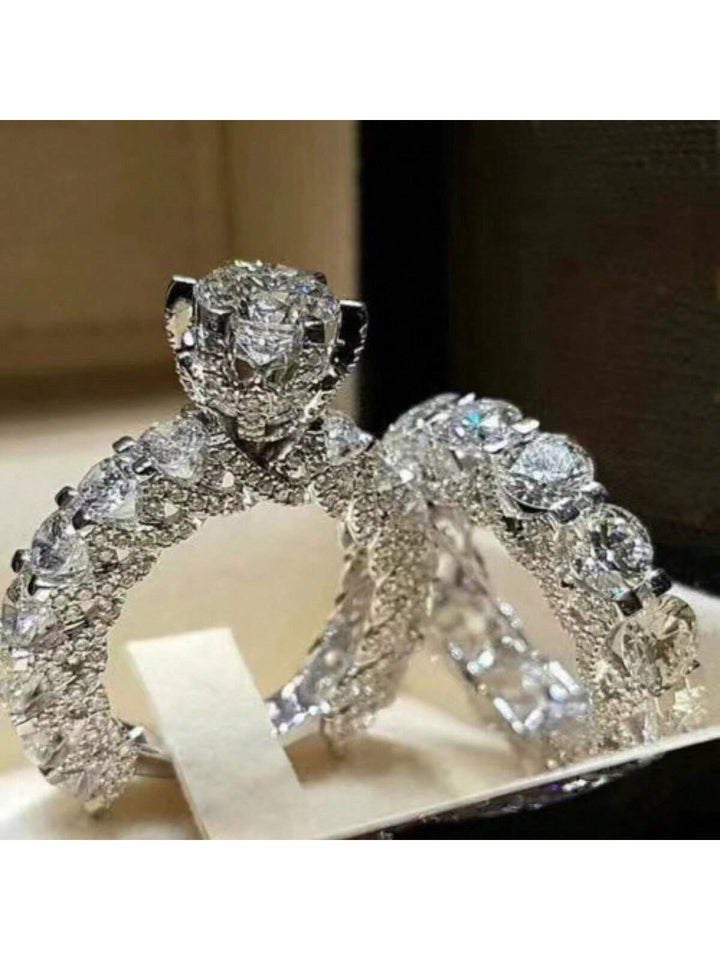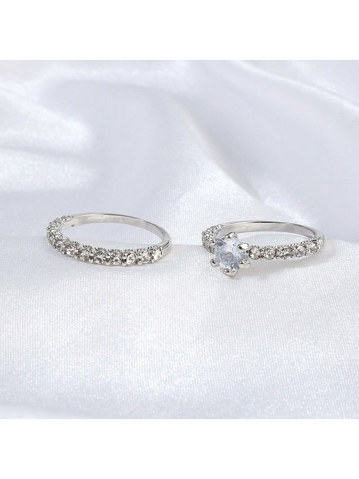 Shein - 1Pair European & American Style 2-In-1 Rhinestone Inlaid Ring Suitable For Bridal Wedding