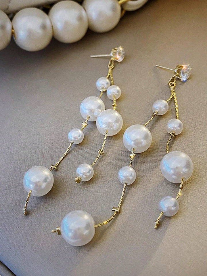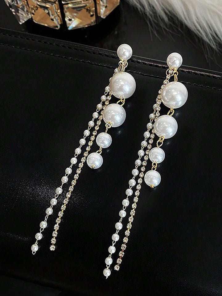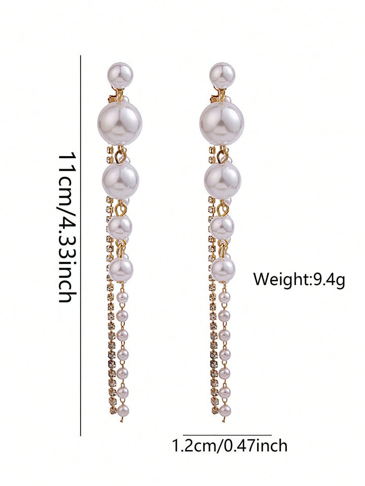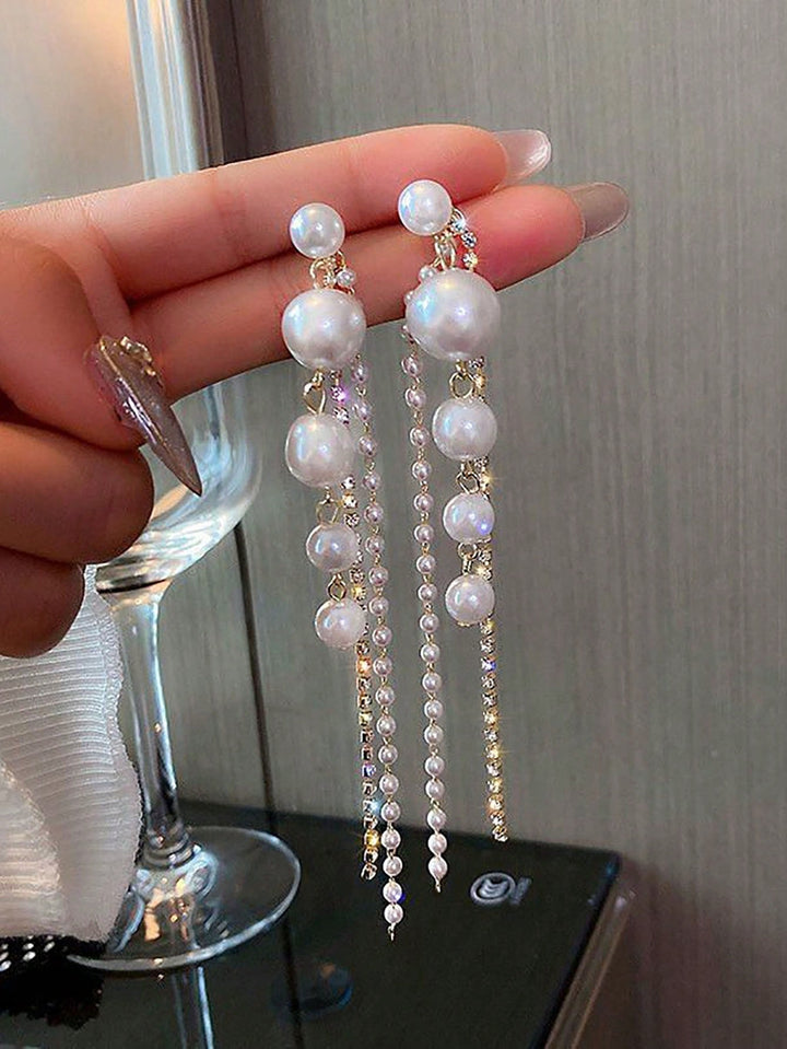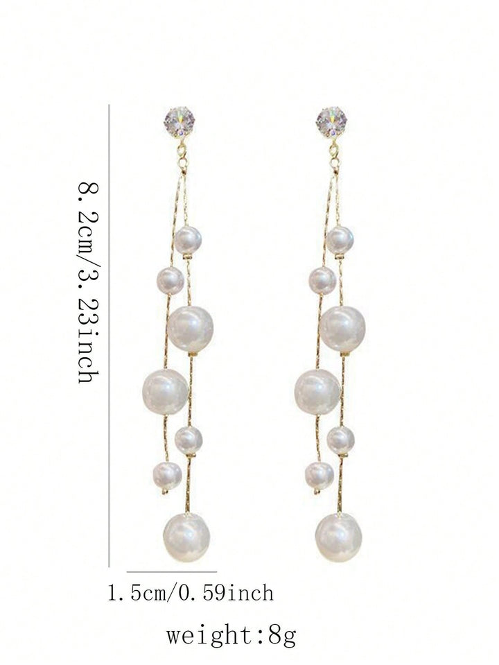 Shein - 1Pair Fashionable Copper Alloy Long Beaded Tassel Dangle Earrings For Women For Banquet, Prom, Party