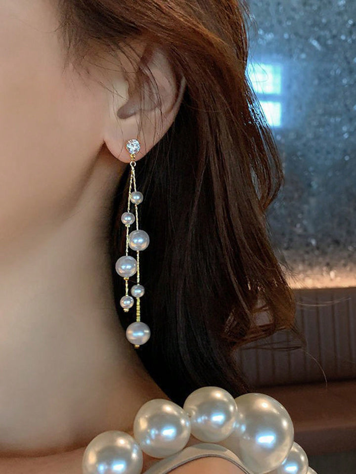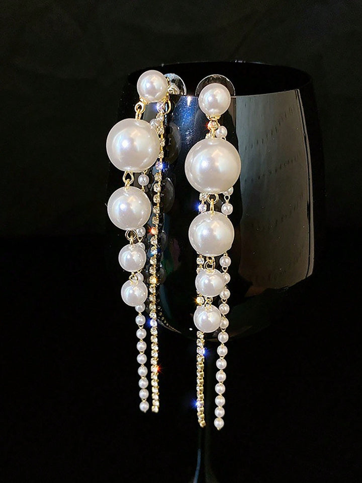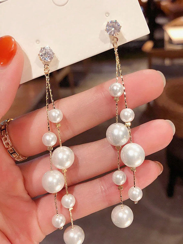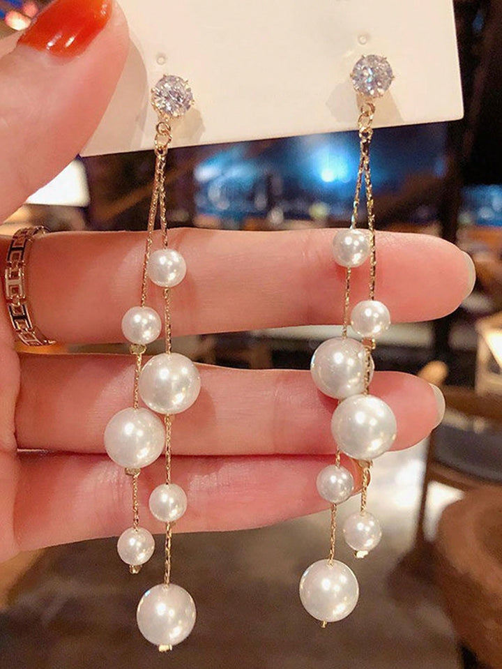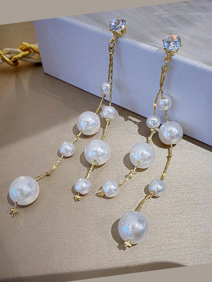 Shein - 1Pair Fashionable Copper Alloy Long Beaded Tassel Dangle Earrings For Women For Banquet, Prom, Party