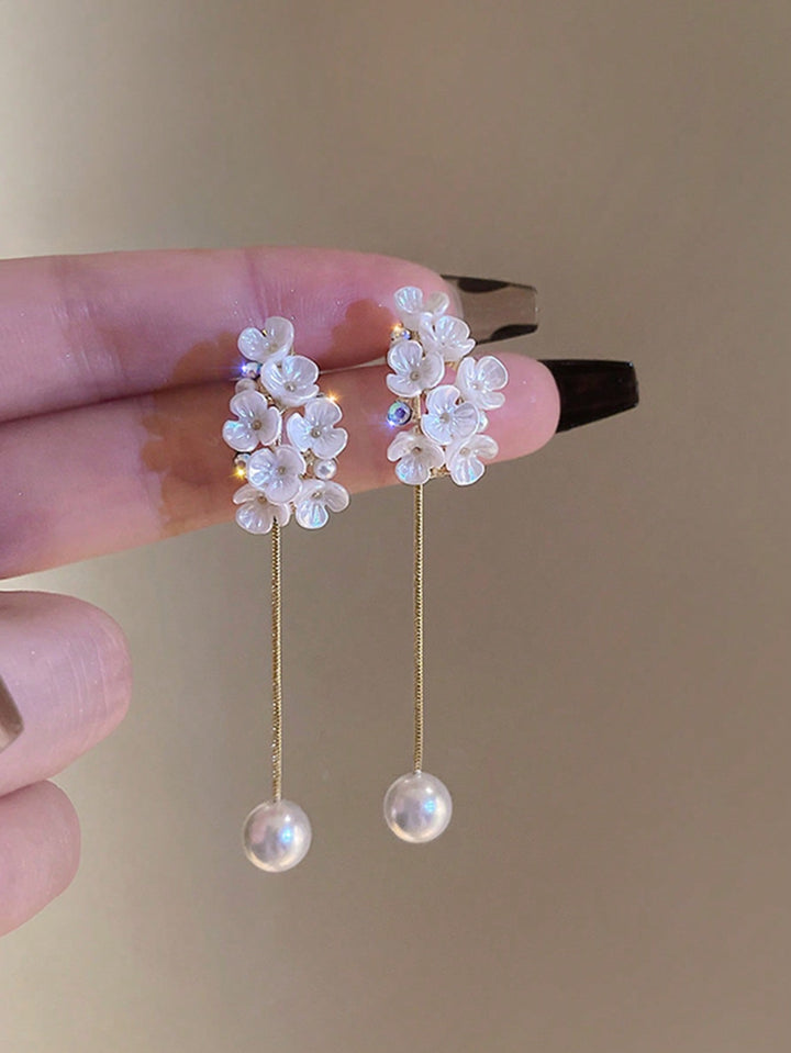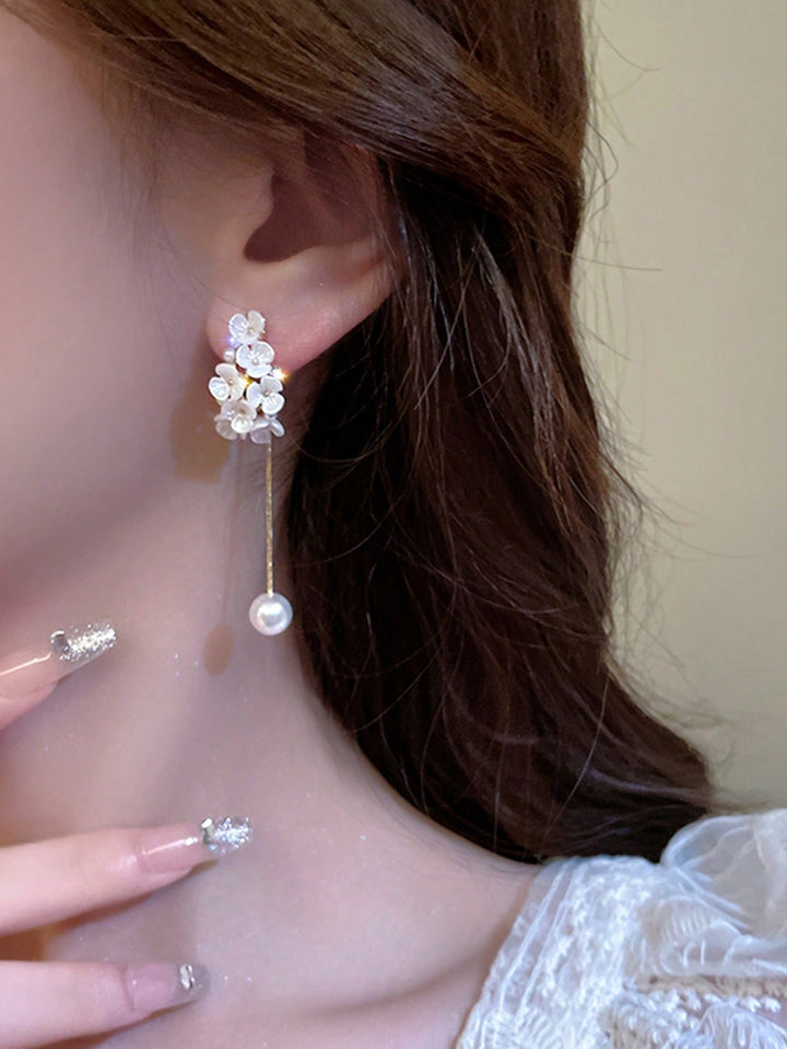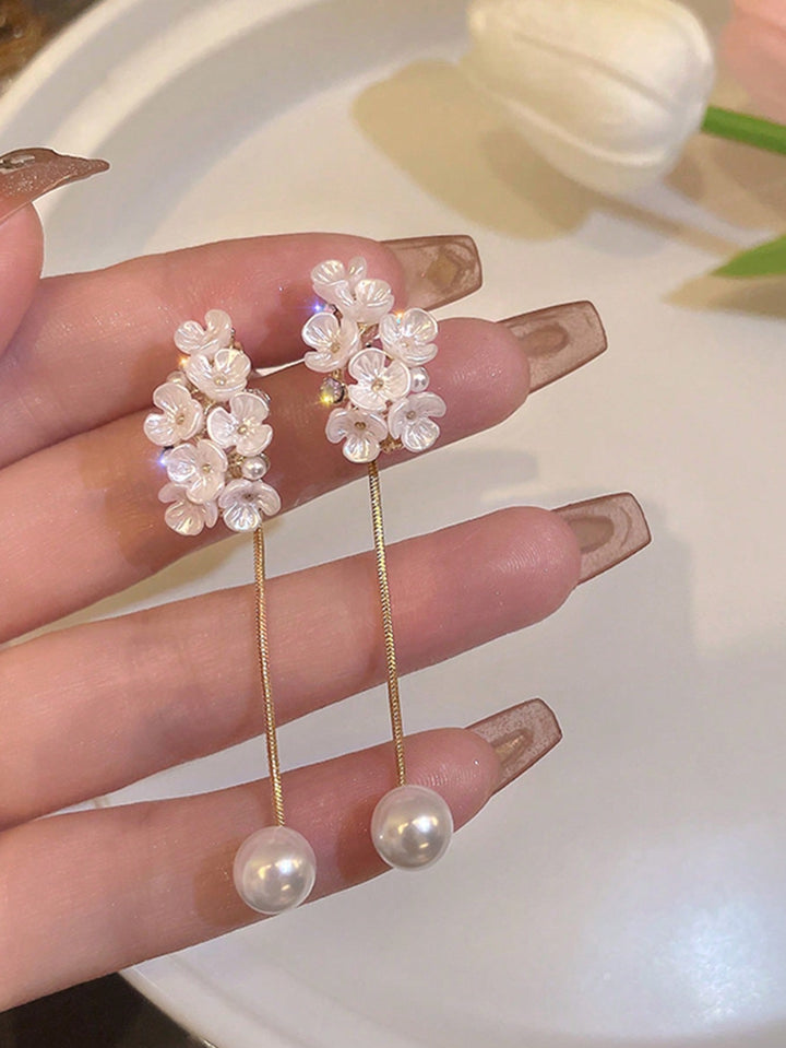 Shein - 1pair Fashionable Zinc Alloy Flower & Faux Pearl Decor Drop Earrings For Women For Daily Decoration