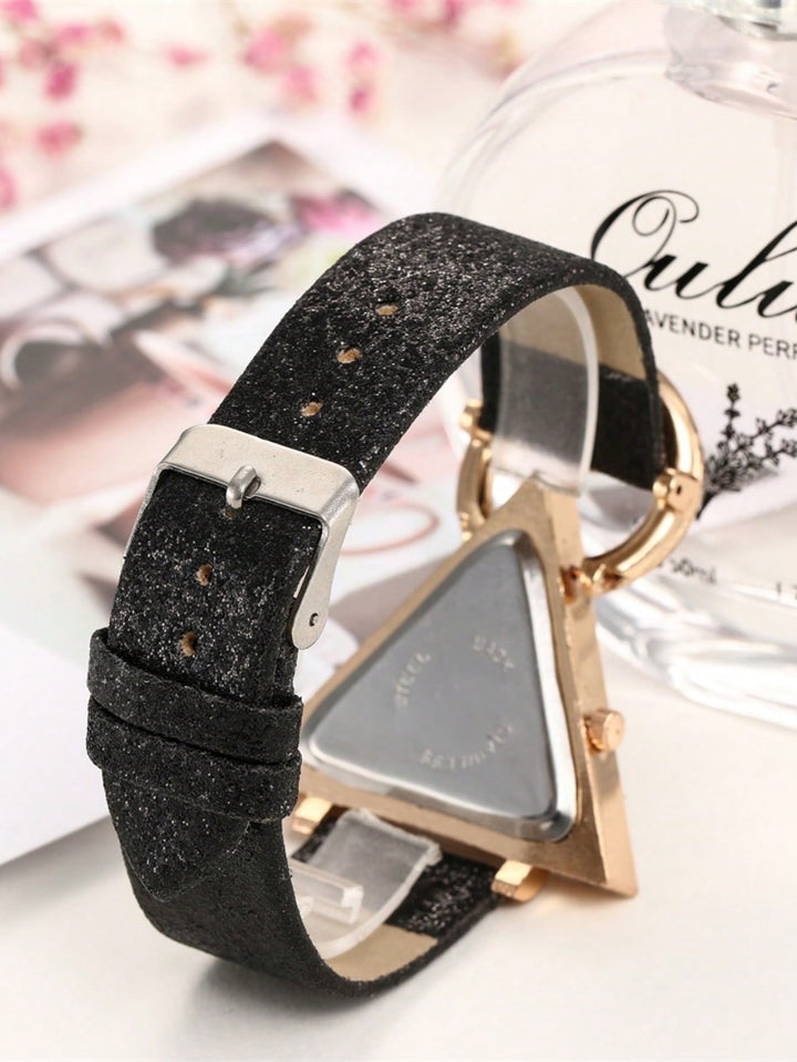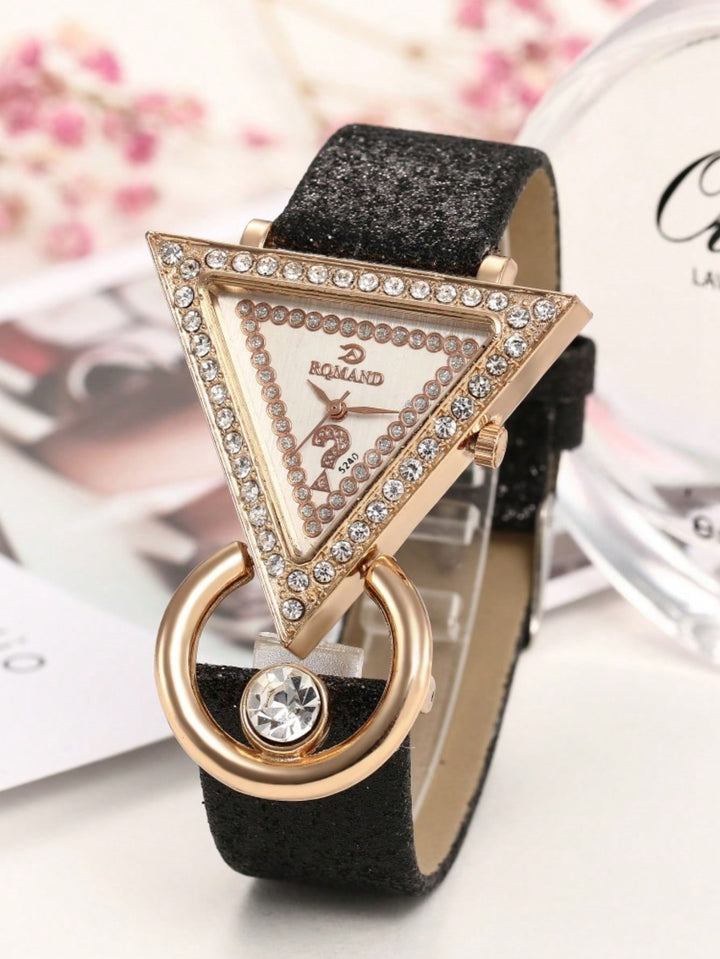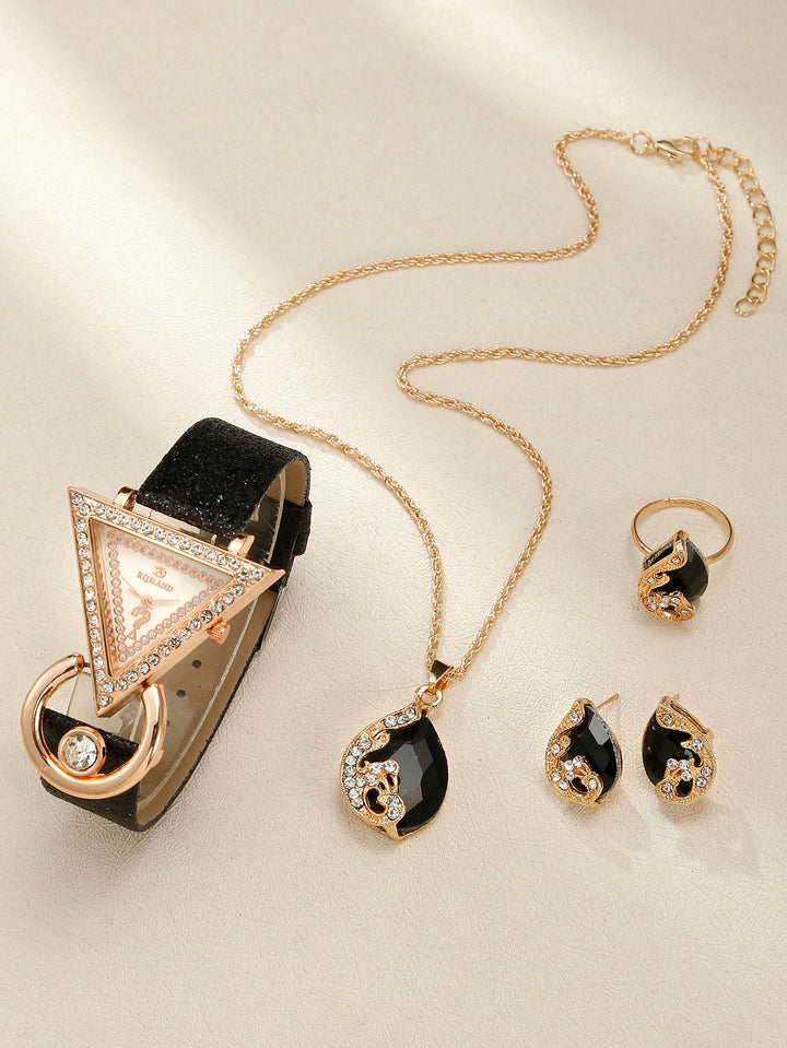 Shein - 1Pc Black Pu Polyurethane Strap Glamorous Rhinestone Decor Triangle Dial Quartz Watch & 4Pcs Jewelry Set, For Daily Life