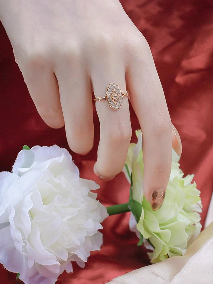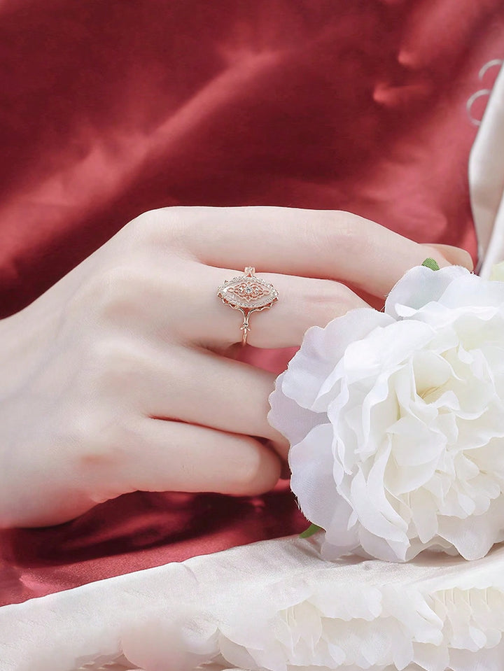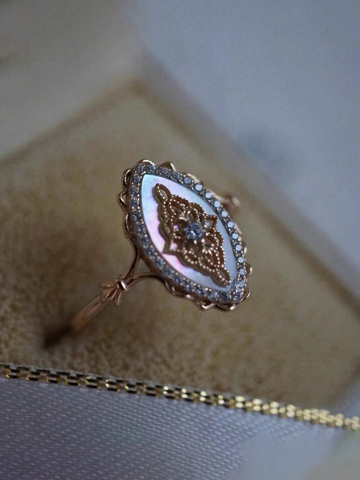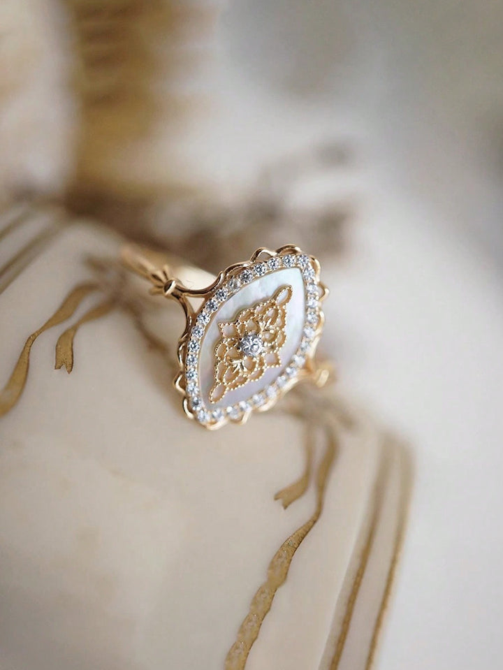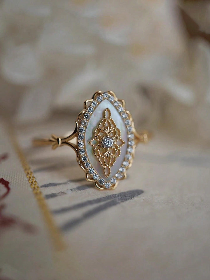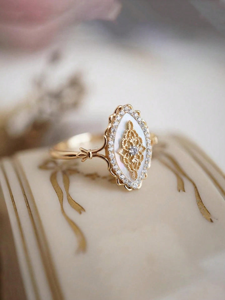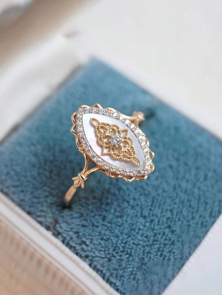 Shein Exclusive - 1pc Classic Japanese Style Fantasy White Shell Inlaid With Lace & S925 Silver Plated 14k Gold Ring For Women's Daily Wear