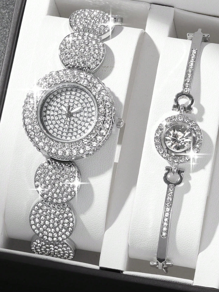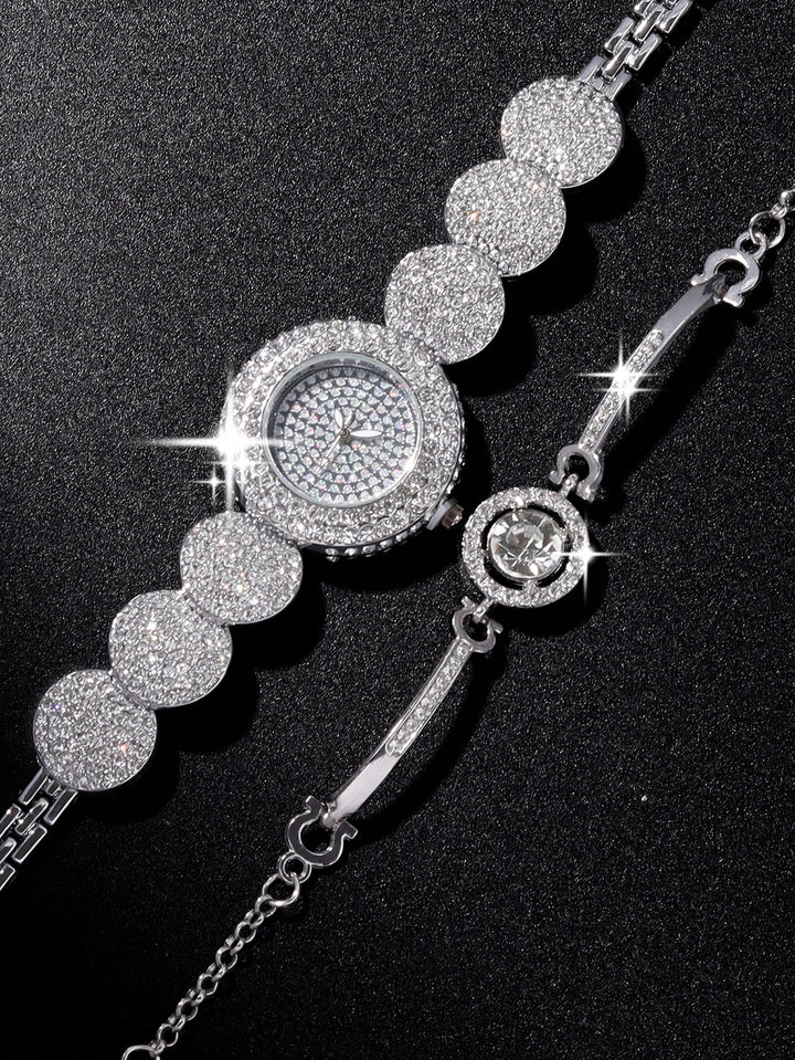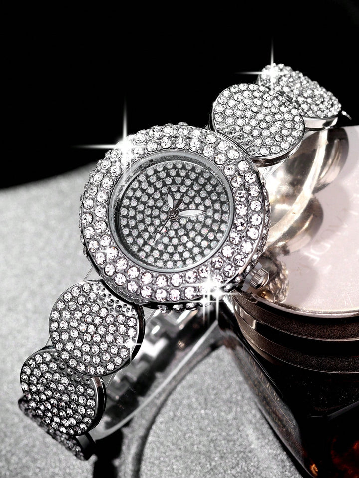 Shein - 1pc Fashion Trend Full Diamond Round Women's Steel Band Silver Quartz Watch with Large Bright Stone Shining Diamond Bracelet Set