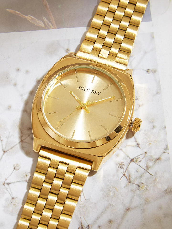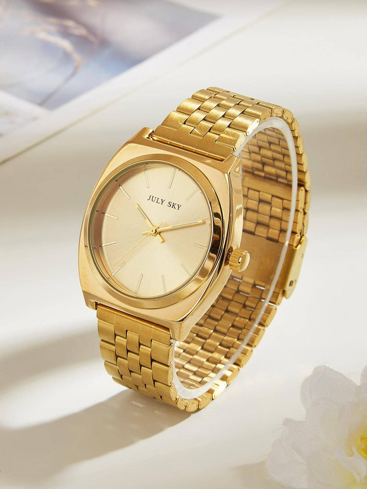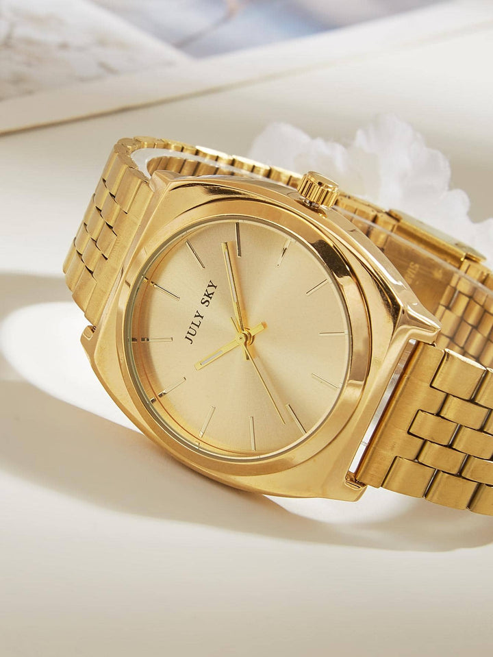 Shein - 1pc Gold-colored Fashionable Simple Stainless Steel Watch Band With Bar Scale Dial Quartz Watch, Suitable For Holiday Gift
