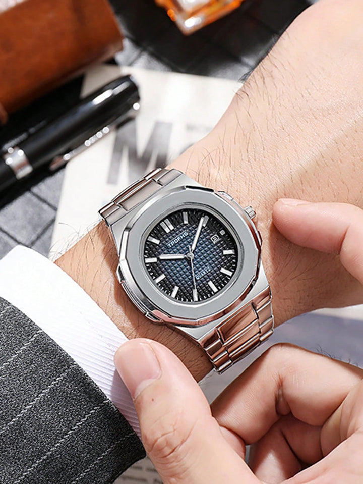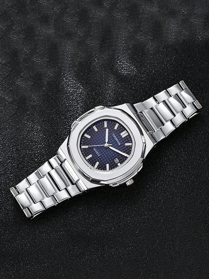Shein - 1pc Men Silver Zinc Alloy Strap Casual Date Round Dial Quartz Watch, For Daily Life