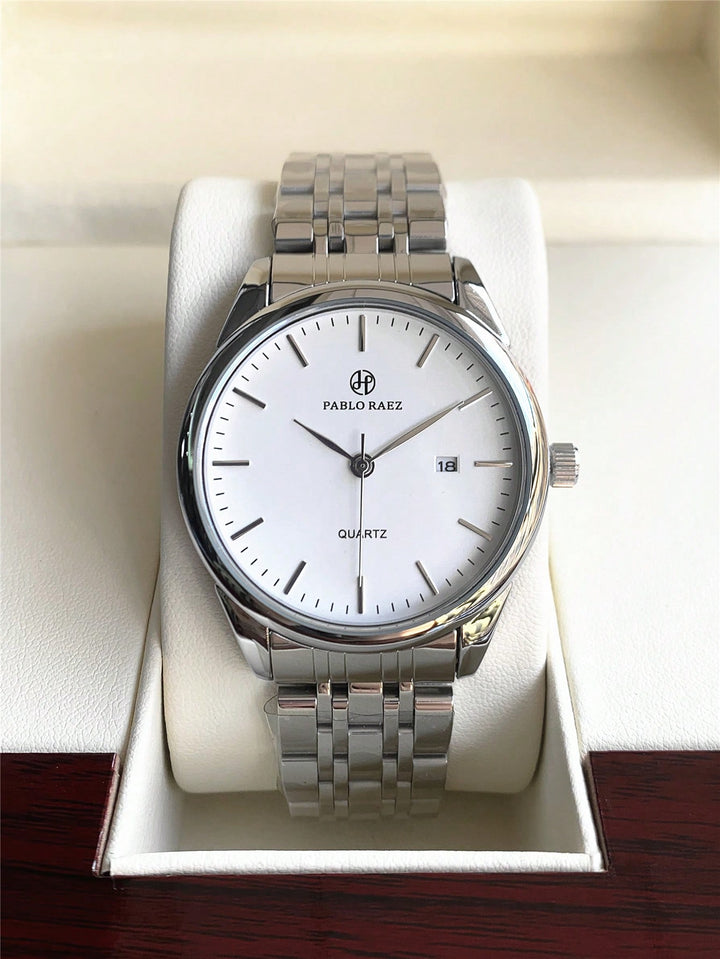 Shein - 1pc Men's Elegant Watch With Simple White Dial, Metal Indices, Calendar, Silver Stainless watch