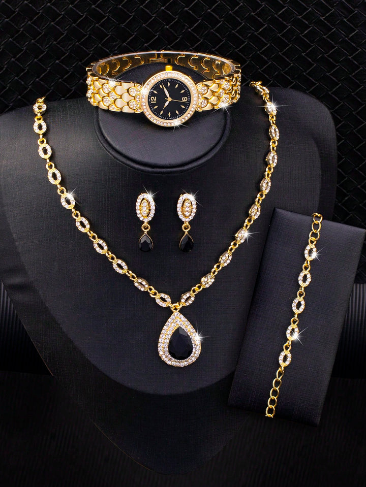 Shein - 1pc Round Pointer Quartz Watch & 4pcs Jewelry Set