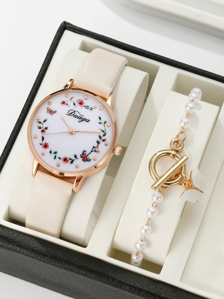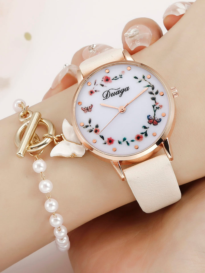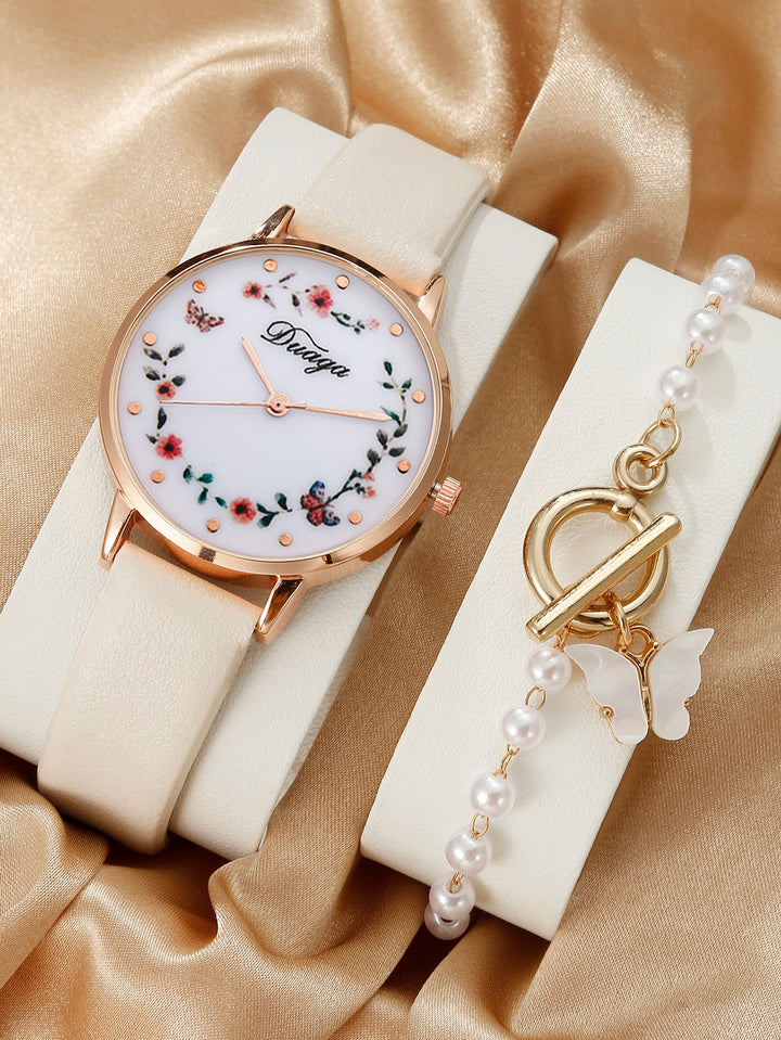Shein - 1pc Women Beige PU Polyurethane Strap Fashionable Flower & Butterfly Pattern Round Dial Quartz Watch & 1pc Chain Bracelet, For Daily Life