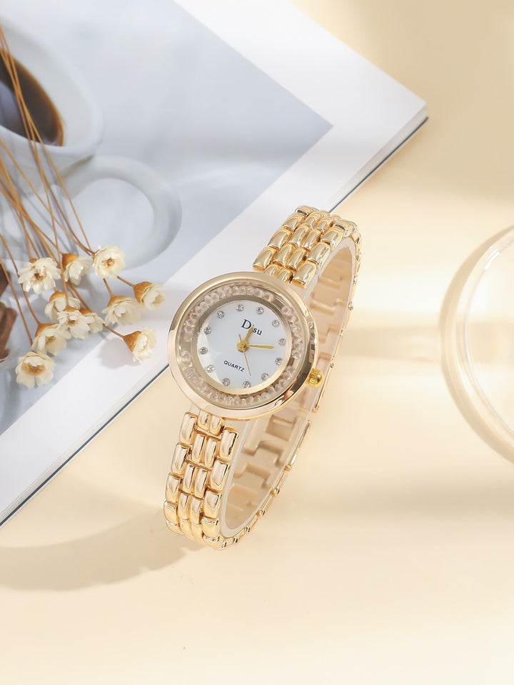 Shein - 1pc Women Gold Zinc Alloy Strap Fashionable Rhinestone Decor Round Dial Quartz Watch, For Daily Decoration