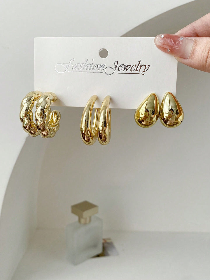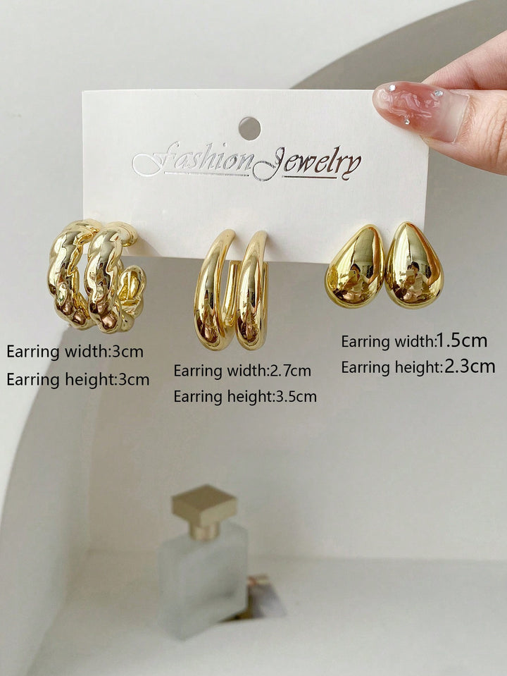 Shein - 1set 3pairs Personality Trendy Earrings Set, Gold Plated Stylish Minimalist Geometric Ear Jewelry