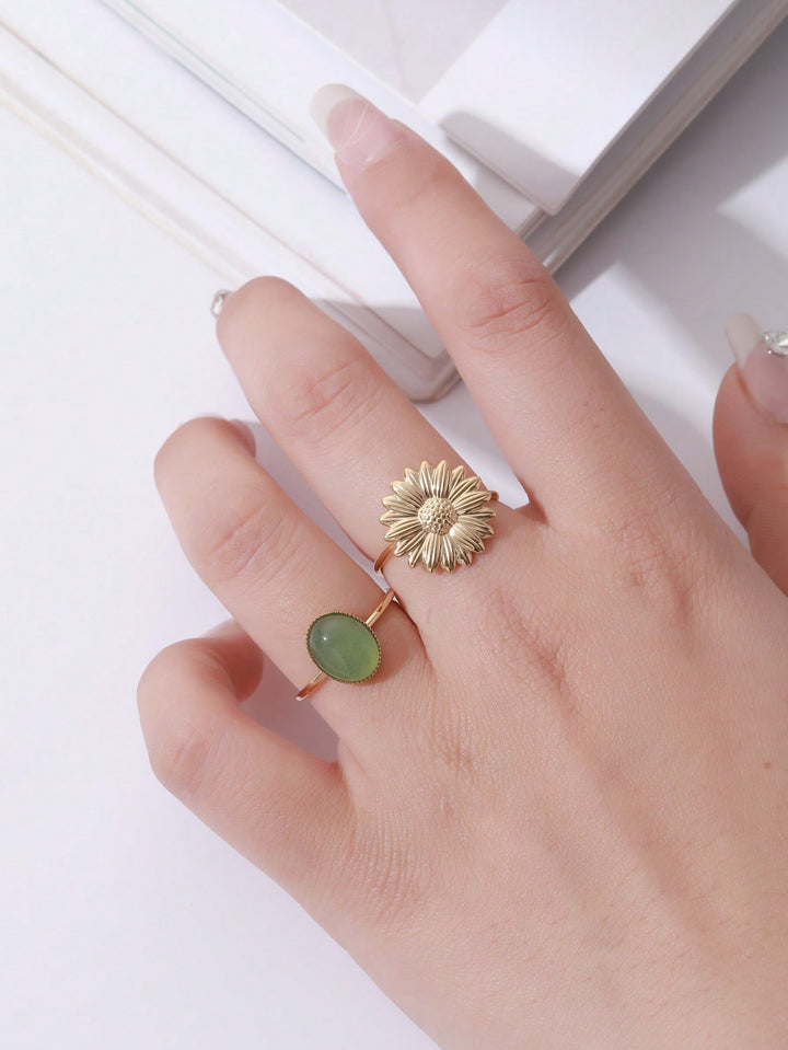 Shein - 2pcs 14k Gold Plated Fashionable Dopamine Style, Baroque Pattern Natural Stone Flower Decorated Open Ring For Women's Daily Use Or Gift