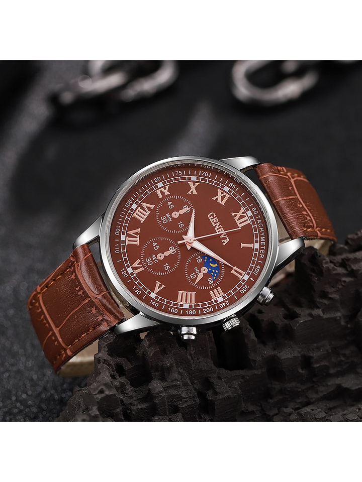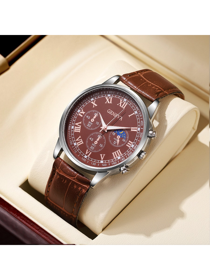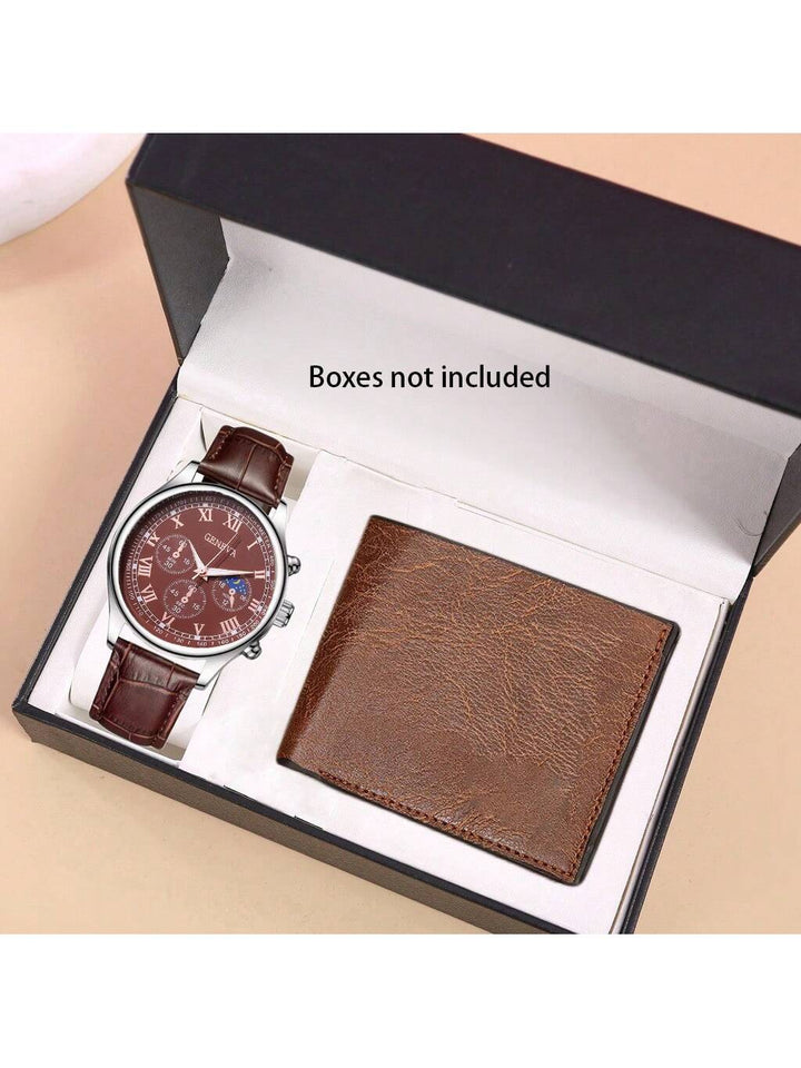 Shein - 2pcs/Set Men's Pu Strap Three Eye Roman Dial Casual Business Quartz Watch And Fashion Layered Wallet Without Box