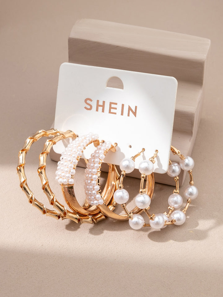 Shein - 3pairs Faux Pearl & Bamboo Joint Decor Hoop Earrings
