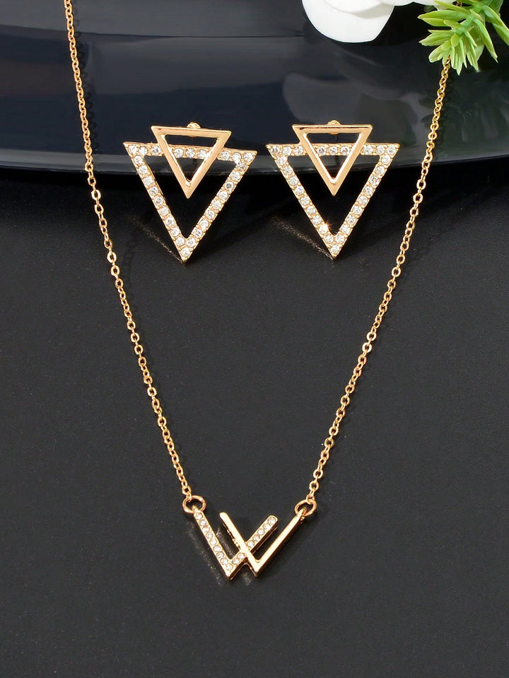 Shein - 3pcs Fashion Jewelry Set Rhinestone Decor Gold Chain Geometric Pendant Necklace Triangle Stud Earrings For Party