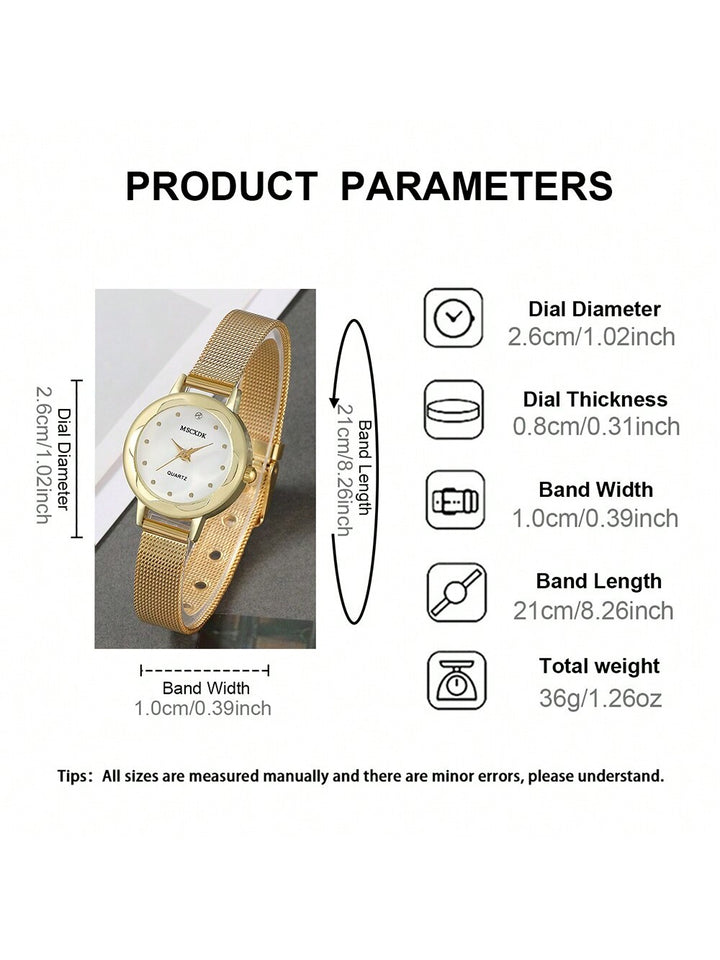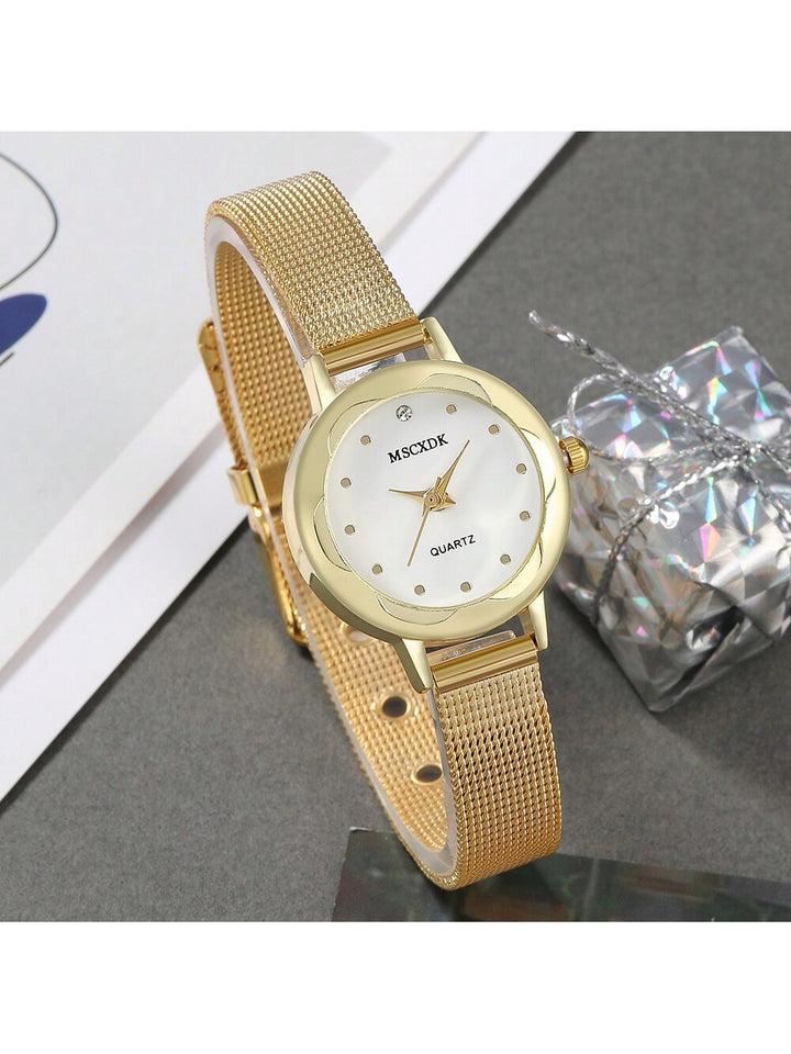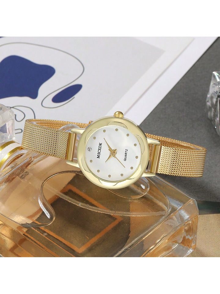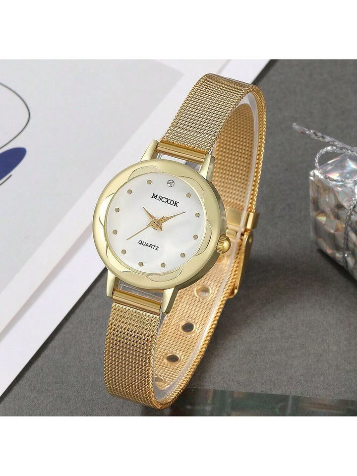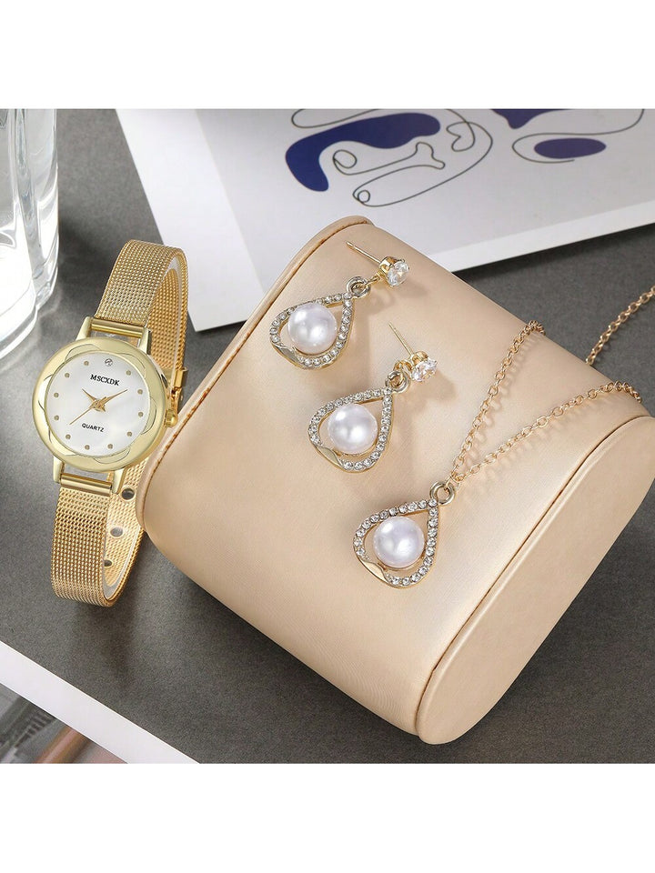 Shein - 4PCS Set Women Simple Gold Watches Analog Quartz Wristwatches & Ladies Necklace Earrings Jewelry Set Dress Clock Montre Femme