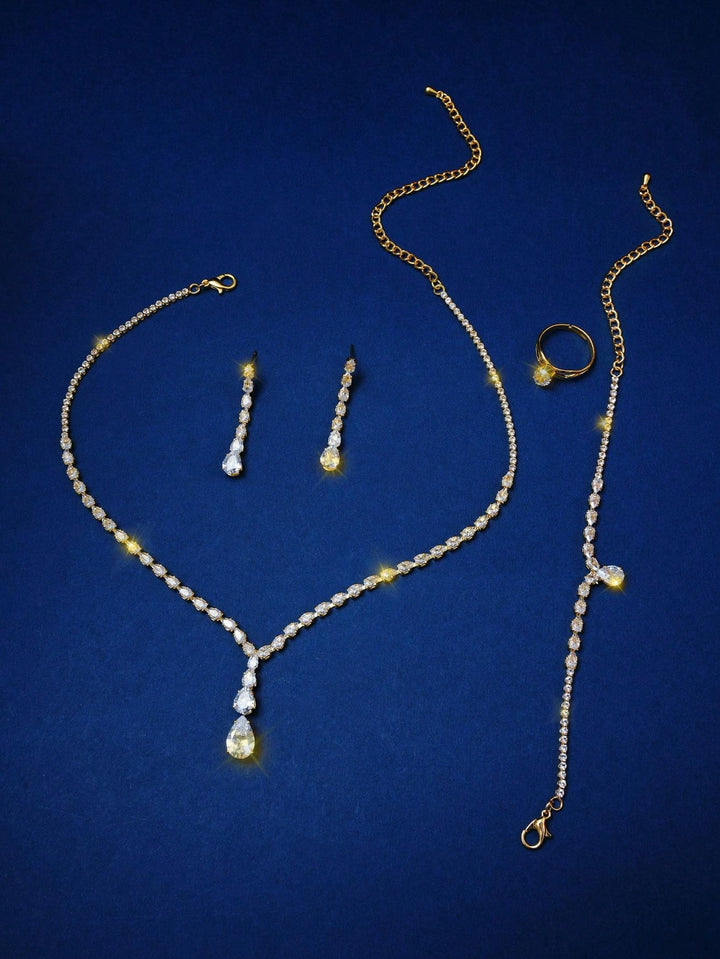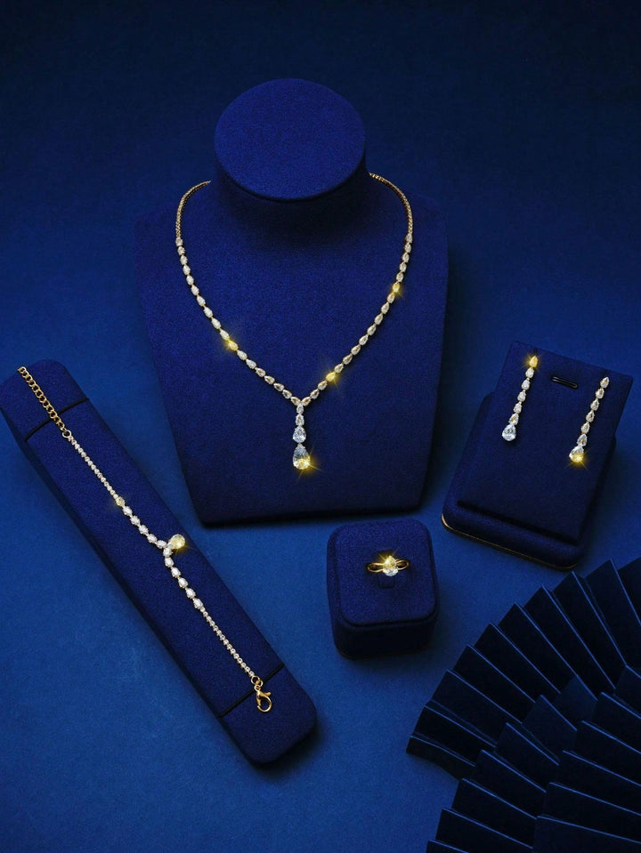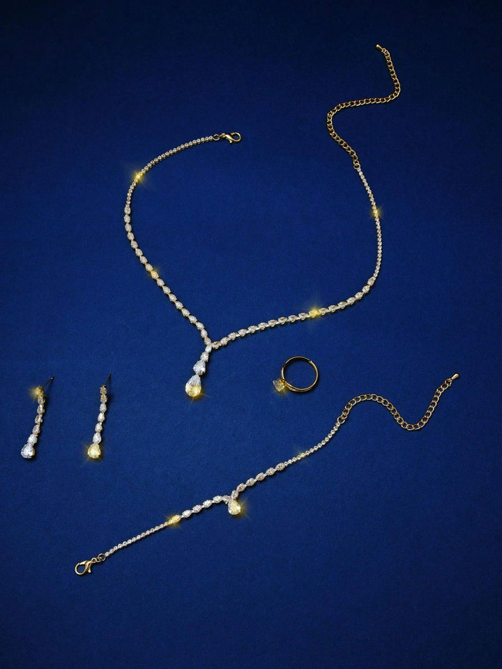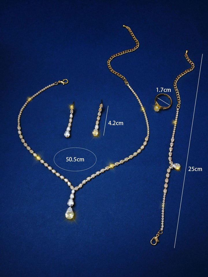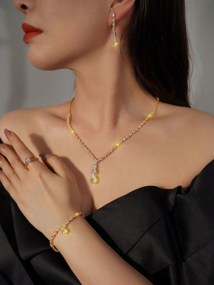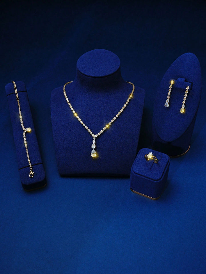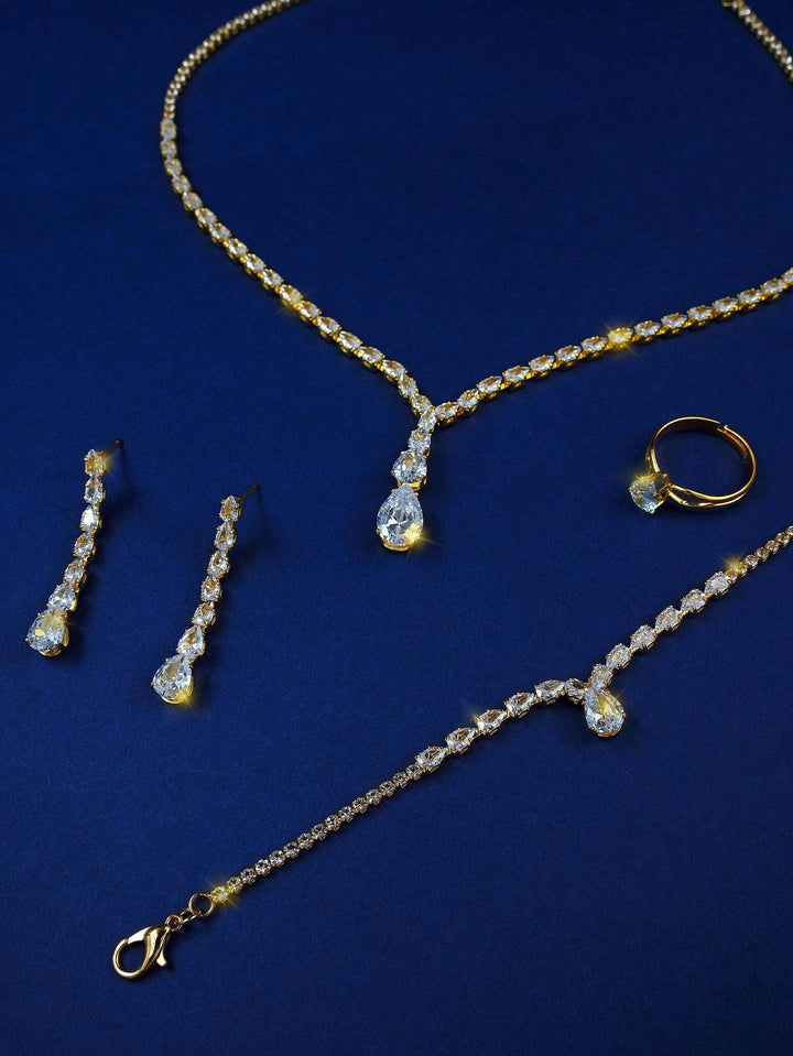 Shein - 5Pcs/Set European And American Style Simple Waterdrop Pendant Set, Including Necklace, Earrings, Ring And Bracelet, Suitable For Women To Wear At Weddings, Birthdays, Festivals Or Parties