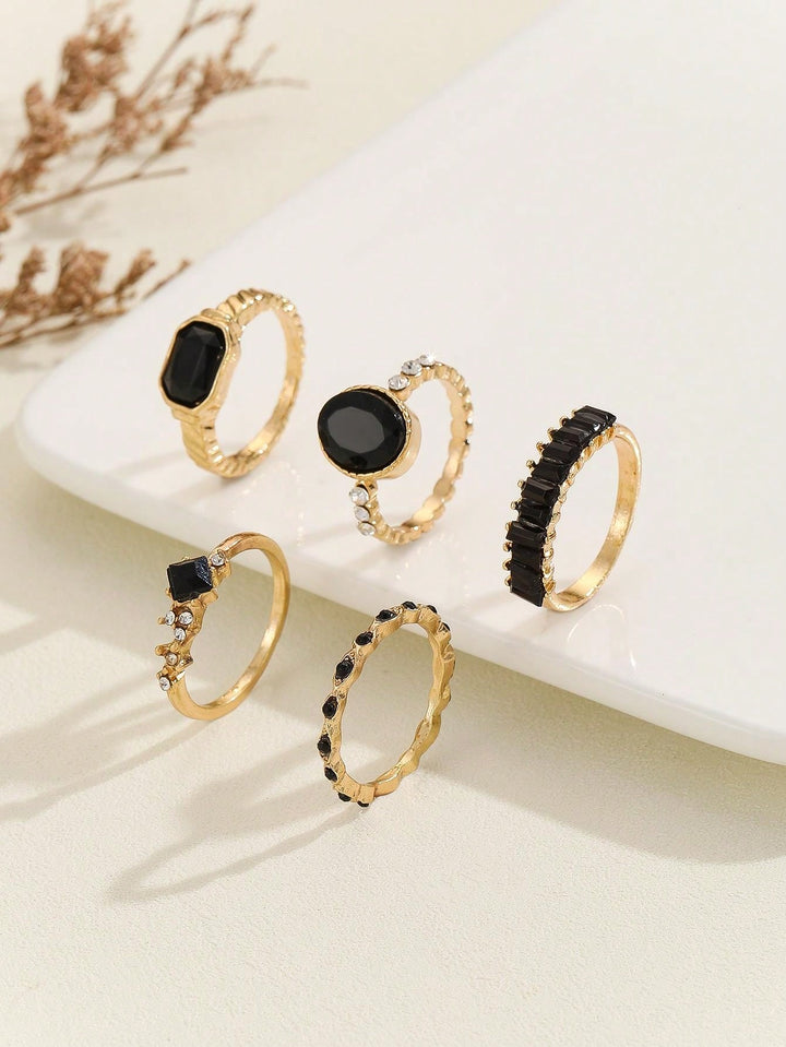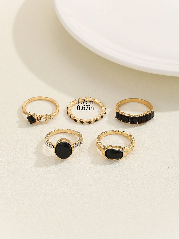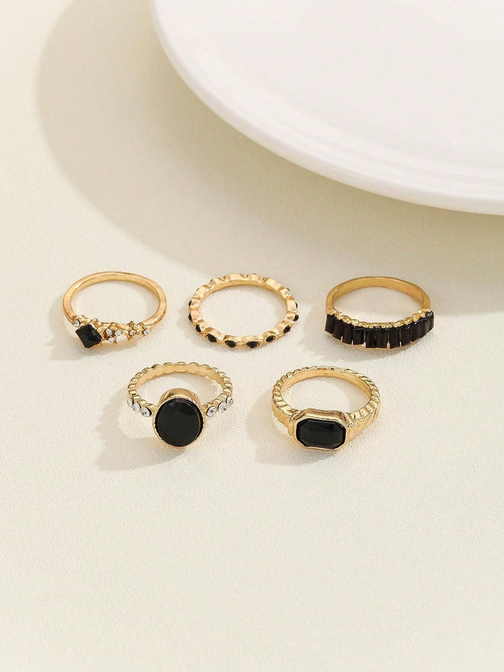 Shein - 5pcs/set Simple Design Black Stone Inlaid Ring Set, Suitable For Women's Daily Wear