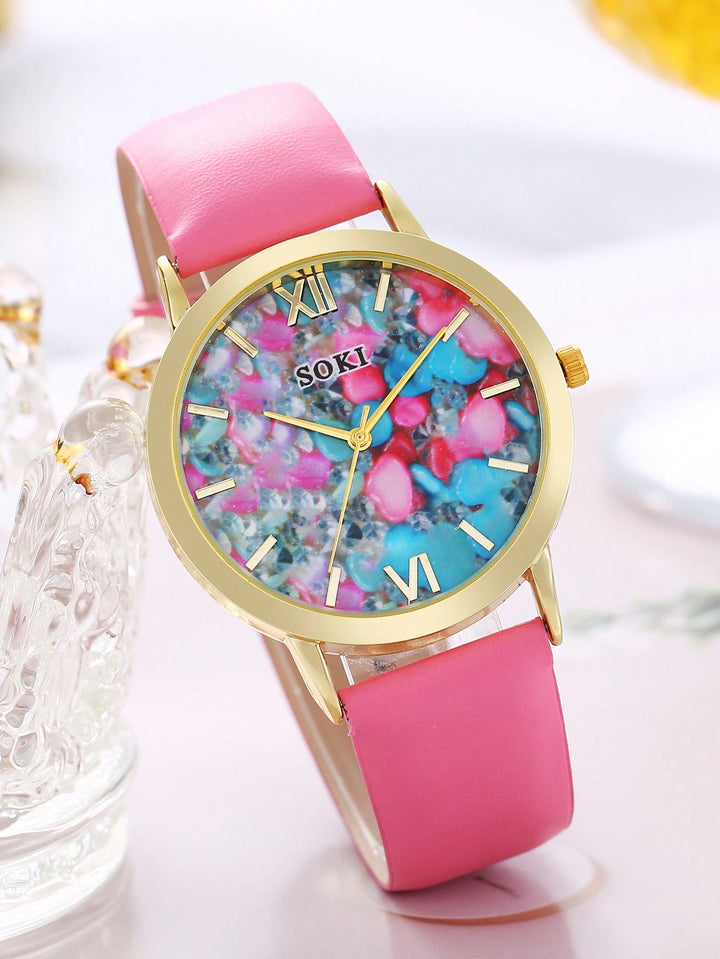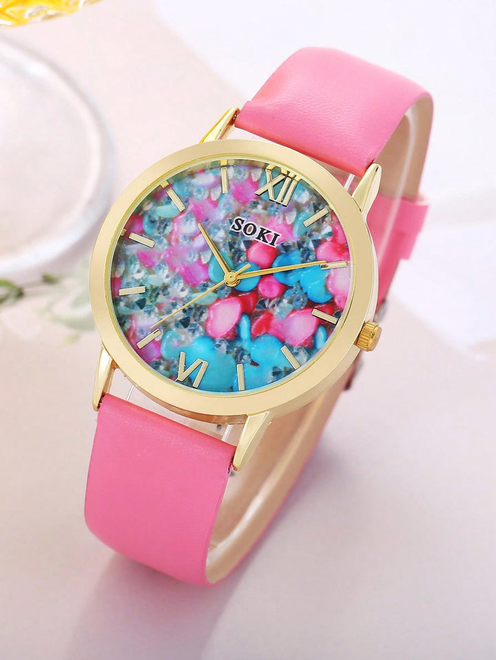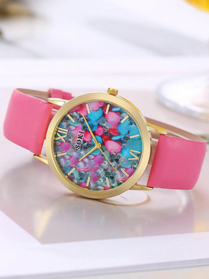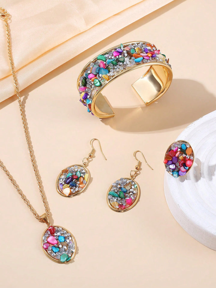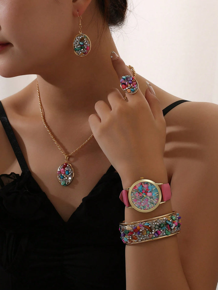 Shein - 6pcs/Set Multicolor Rhinestone & Crushed Stone Inlaid Exaggerated Personality Fashionable Metal Necklace Kit & 1pc Women's Casual Quarts Wrist Watch With Pu Band Suit For Daily And Festival Dressing Up