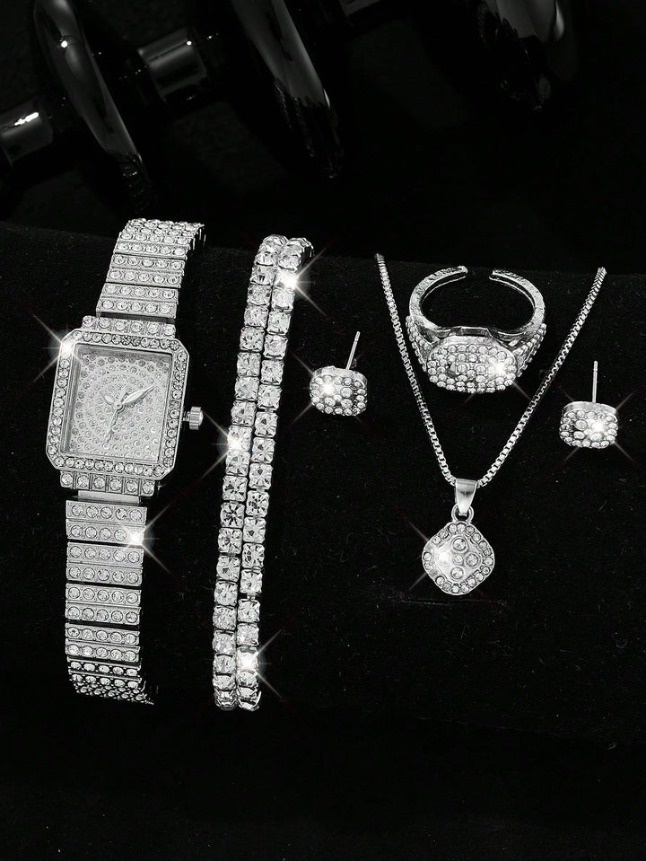 Shein - 7Pcs/Set Women'S Stainless Steel Band Rhinestone-Accented Watch With Rectangular Face, Casual Fashion Style, Including Diamond-Accented Alloy Bracelet, Necklace, Earrings, Rings & Watch Accessory Set
