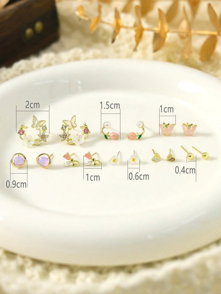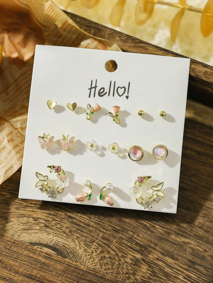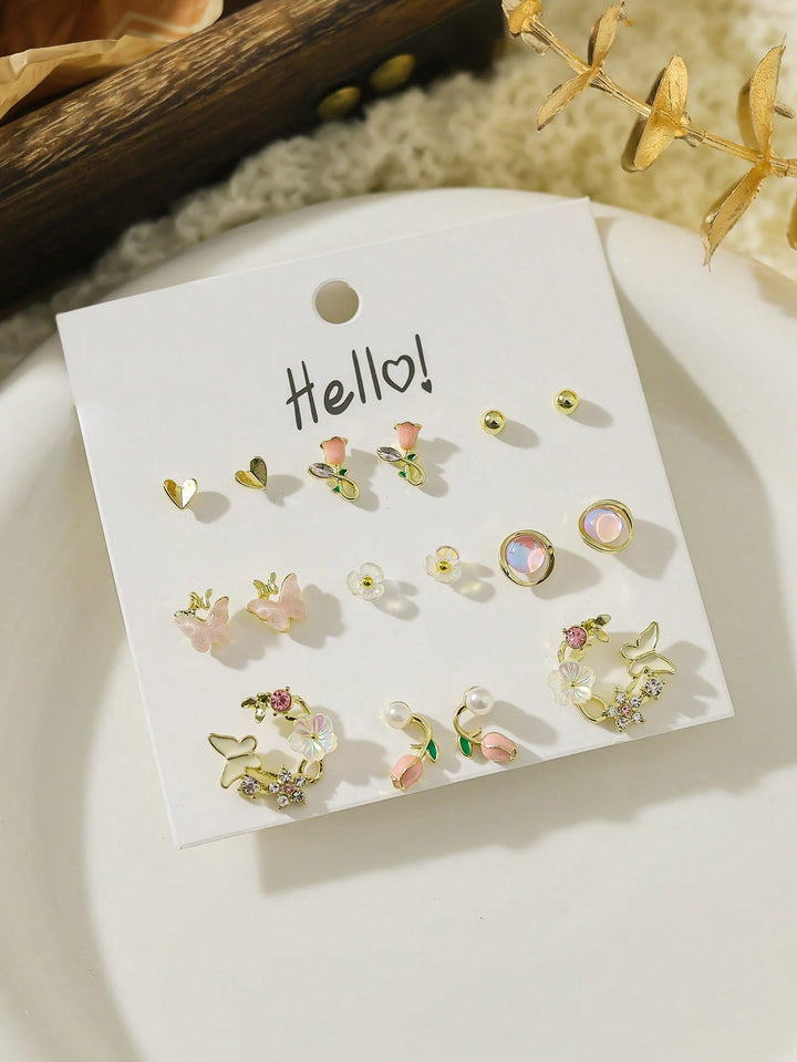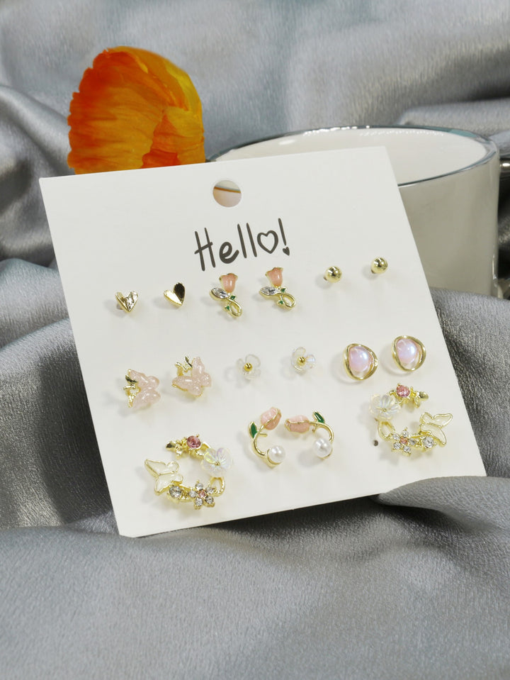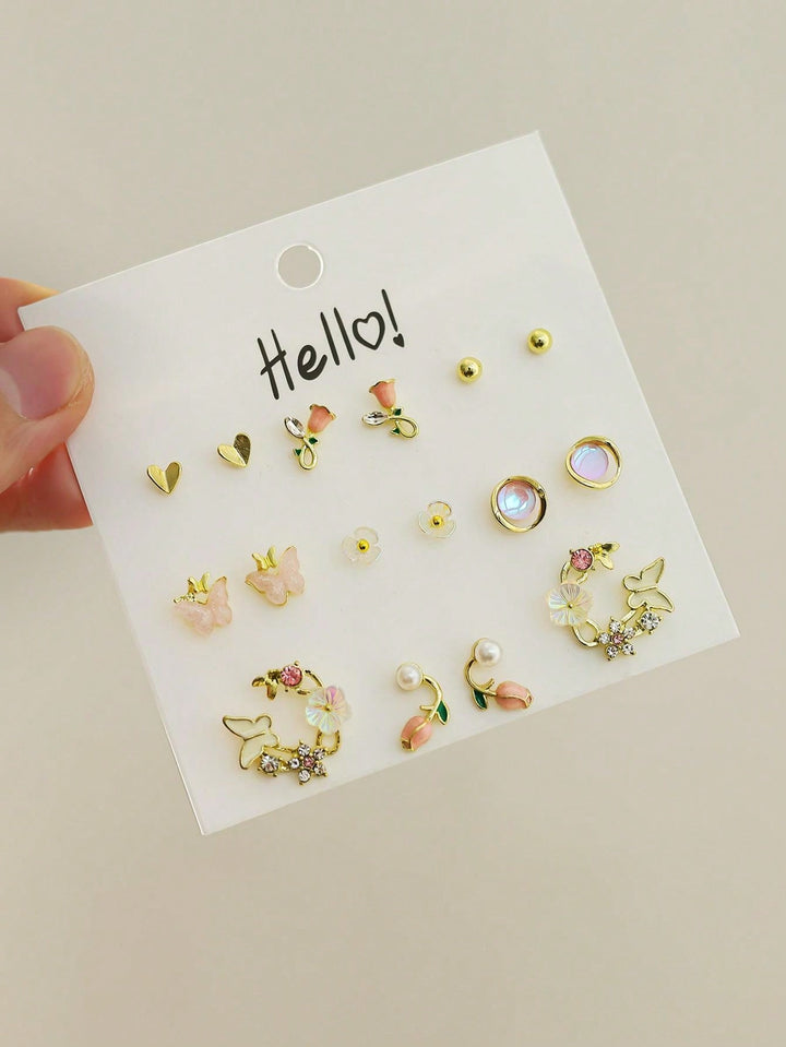 Shein - 8pairs/Set Zinc Alloy Gold-Plated Butterfly & Flower & Heart Shaped Stud Earrings, Cute And Suitable For Women's Daily Wear