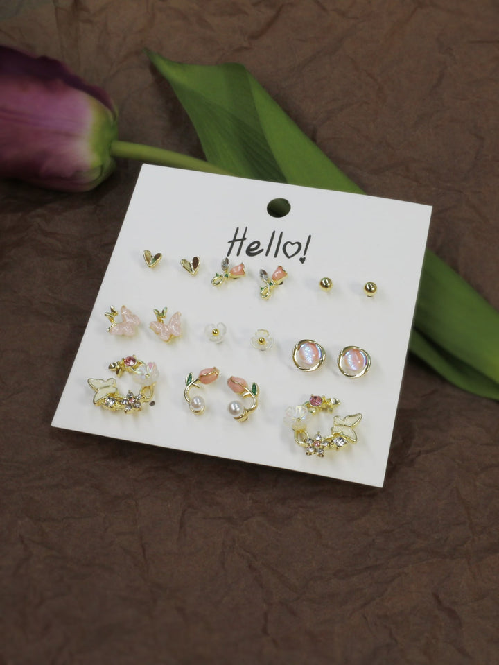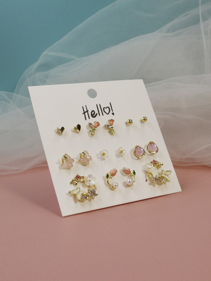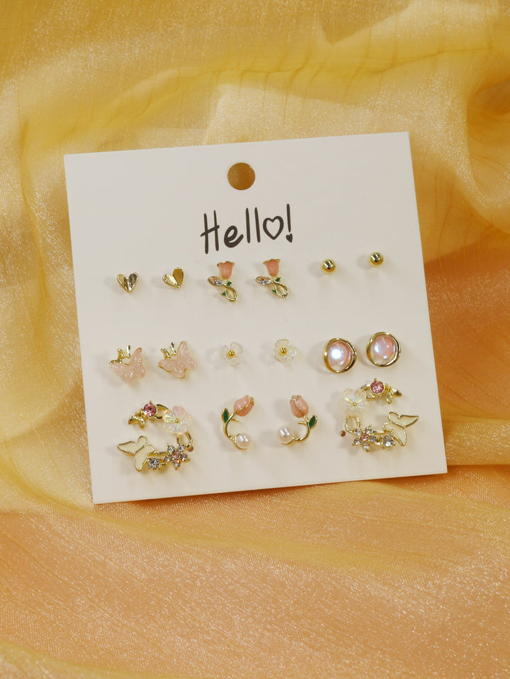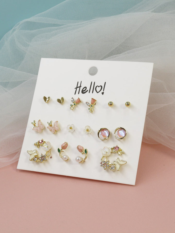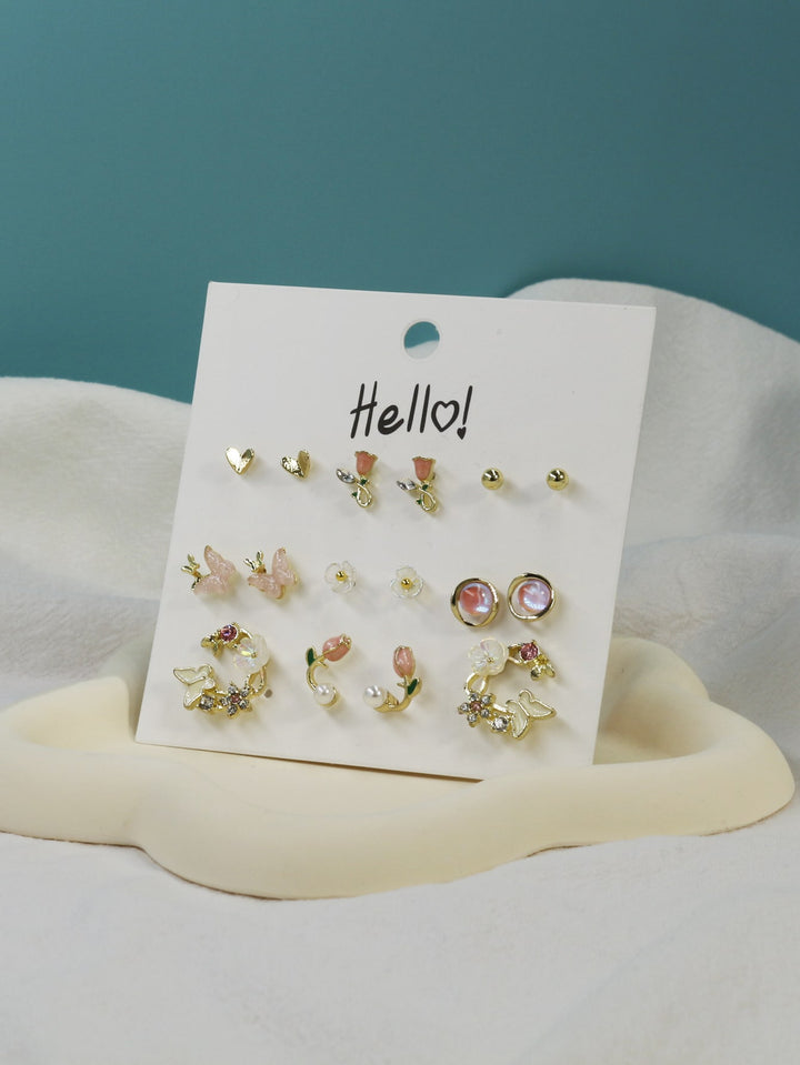 Shein - 8pairs/Set Zinc Alloy Gold-Plated Butterfly & Flower & Heart Shaped Stud Earrings, Cute And Suitable For Women's Daily Wear