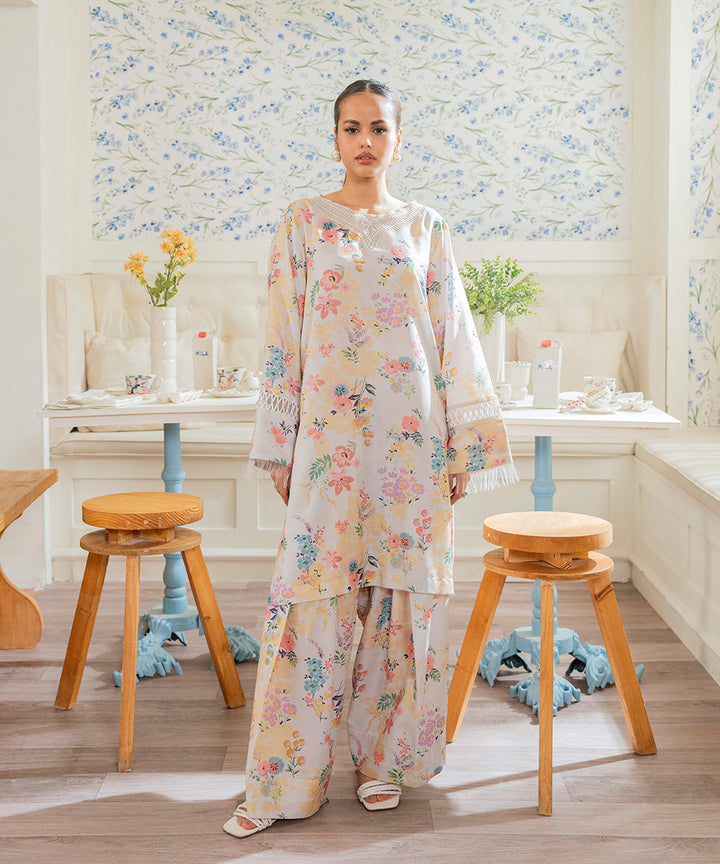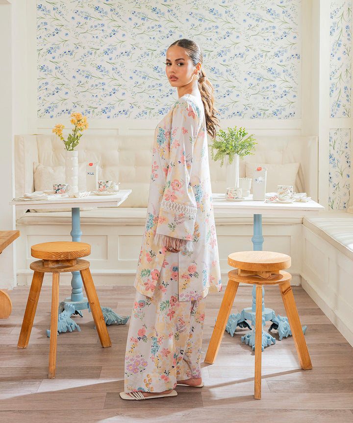 Description: This graceful 2-piece silk lawn outfit showcases a vibrant multicolor floral digital print, beautifully enhanced with delicate embroidery on the neckline. White lace detailing on the sleeves adds a refined, elegant touch. Paired with a classic farshi shalwar, it blends traditional charm with contemporary flair, perfect for festive or casual occasions.