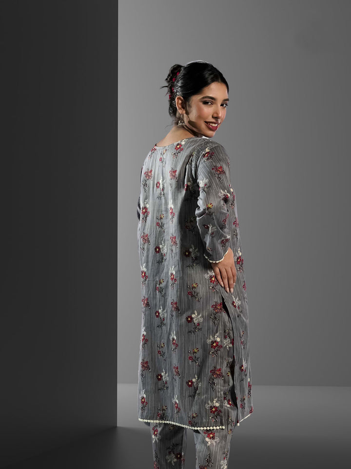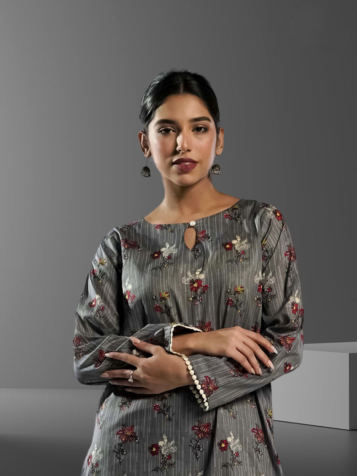 The image features a beautiful woman wearing a grey floral dress, which is a part of the latest collection by Alham. The dress is made of cambric fabric, known for its durability and comfortable fit. The floral pattern adds a touch of elegance and charm to the outfit, making it perfect for various occasions such as weddings, parties, or formal events. The woman is posing confidently, showcasing the dress's stylish design and the overall appeal of the Alham brand.