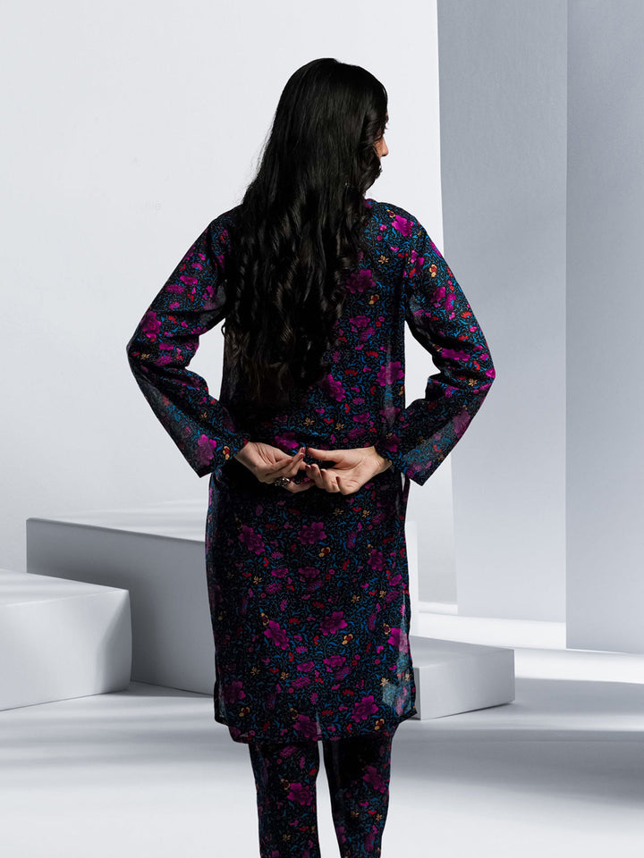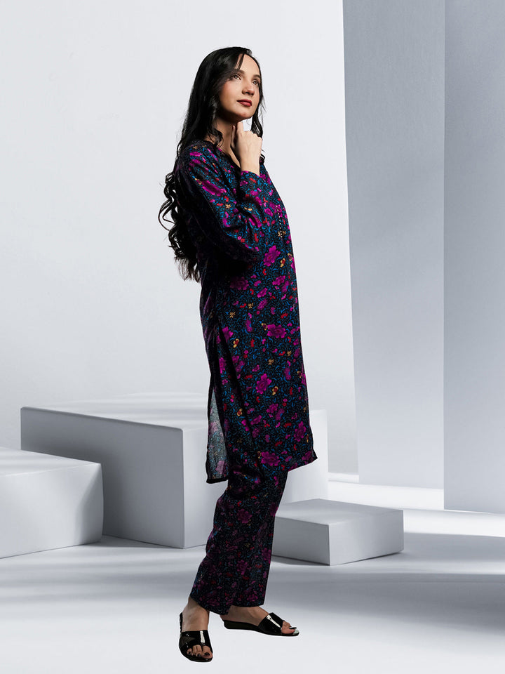 This stunning floral print dress features a beautiful blend of purple and blue tones. Crafted from high-quality cambric fabric, known for its lightweight and breathable properties, this dress is perfect for winter days and casual wear. The elegant floral design adds a touch of sophistication, making it a versatile addition to your wardrobe. Easily pair it with various accessories to create a complete and stylish look.