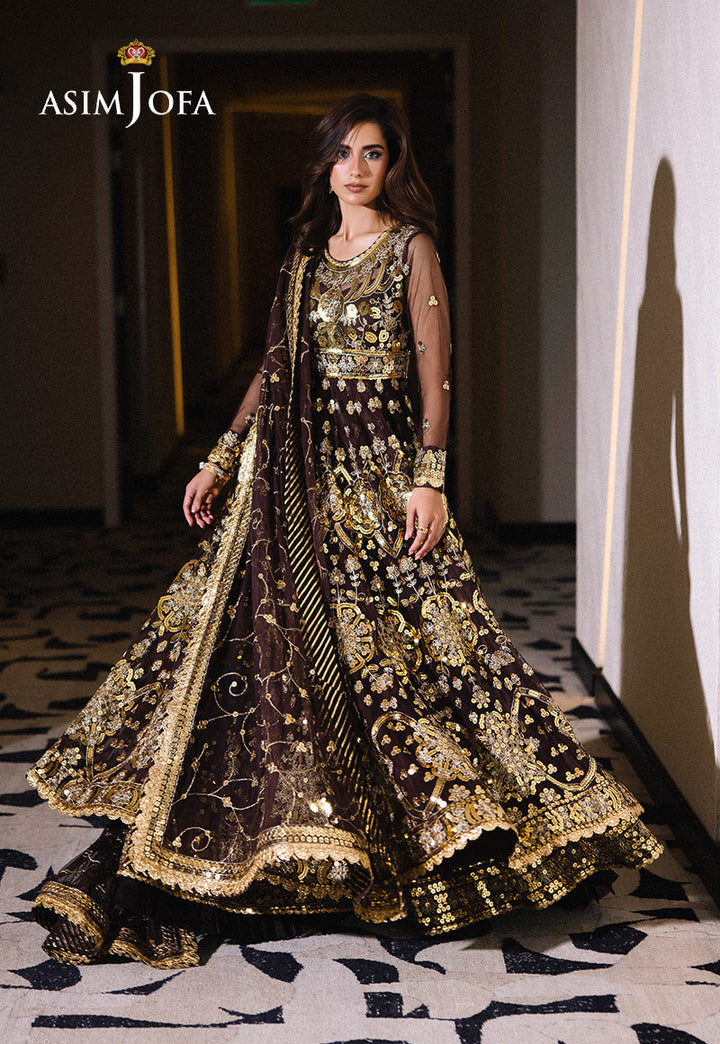 Radiating timeless allure, this brown long-flared peshwas is a true testament to royal sophistication. The bodice and voluminous silhouette are intricately adorned with glimmering 9mm gold sequins and gorgeous gold zariwork, creating a mesmerizing visual of texture and shine. The lavishly embroidered dupatta completes the look, adding layers of elegance and finesse. This ensemble is a showstopper for any grand celebration, designed to leave an unforgettable impression.