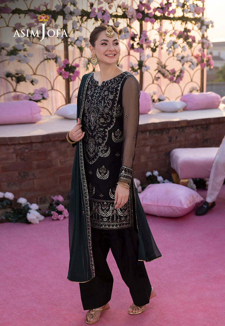 Asim Jofa’s “Jag Mag Collection” brings to you this black number, a creation that mirrors the mystique of a starry night. This onyx beauty is a canvas of celebration adorned with a gorgeous embroidered neckline and a shirt blooming with botanical motifs, intricately stitched with off-white threadwork that contrasts stunningly against the dark fabric. The ensemble is sprinkled with multi-colored transparent sequins adding a touch of whimsy and wonder. Completing the look is a matching embroidered dupatta, making this outfit a perfect companion for your festive nights.
