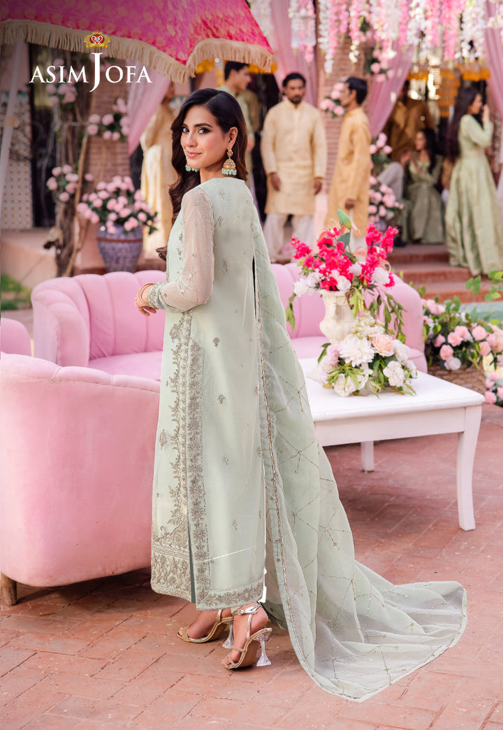 Asim Jofa unveils the “Jag Mag Collection” with this creation where it meets magnificence. This mint number is a symphony of craftsmanship. The neckline of this outfit blooms with intricate embroidery cascading down to the borders in a mesmerizing dance of two-toned zariwork. Each golden sequin twinkles while illuminating the fabric. The traditional motifs tell stories of heritage and joy while the matching embroidered dupatta completes the celestial ensemble. Be the radiant center of every celebration with this luminous creation.