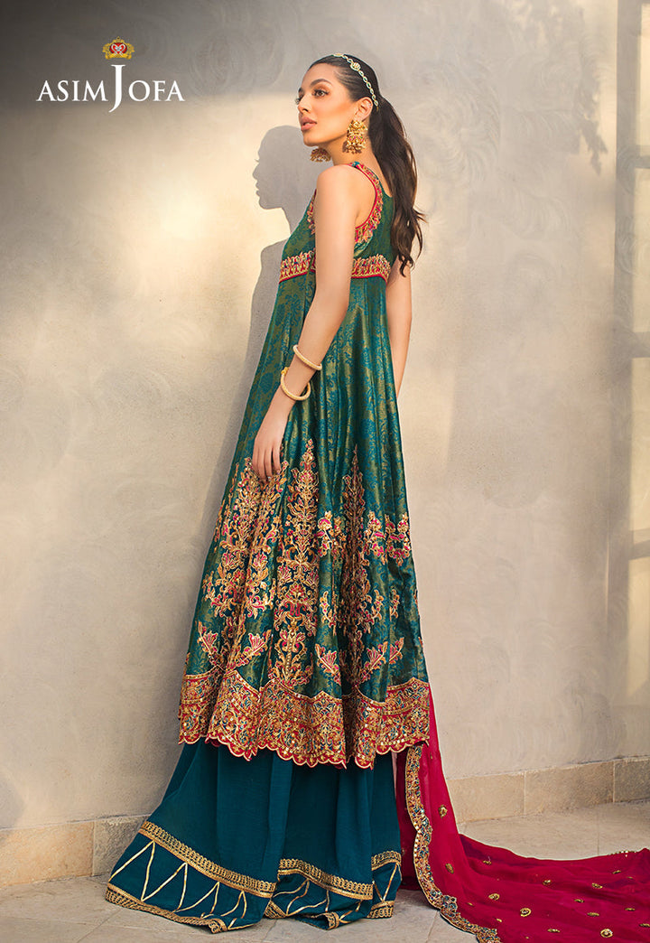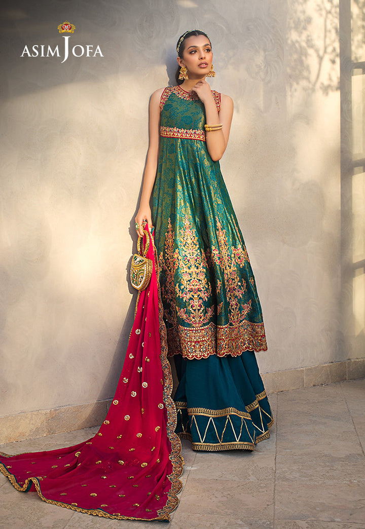 Traditional yet stylish Sasha Raja is a vision to behold in this majestic attire combining the craft of weaving with intricate embroidery. The complementing tones work beautifully enhancing the deep teal jacquard cotton net base in a flowy cut with heavily embroidered motifs and a curved scallop border on shocking pink silk worked meticulously with golden zari, threads and sequins. A chiffon dupatta with embroidered borders and scattered motifs all over with solid dyed pants completing the look of this ensemble.Â