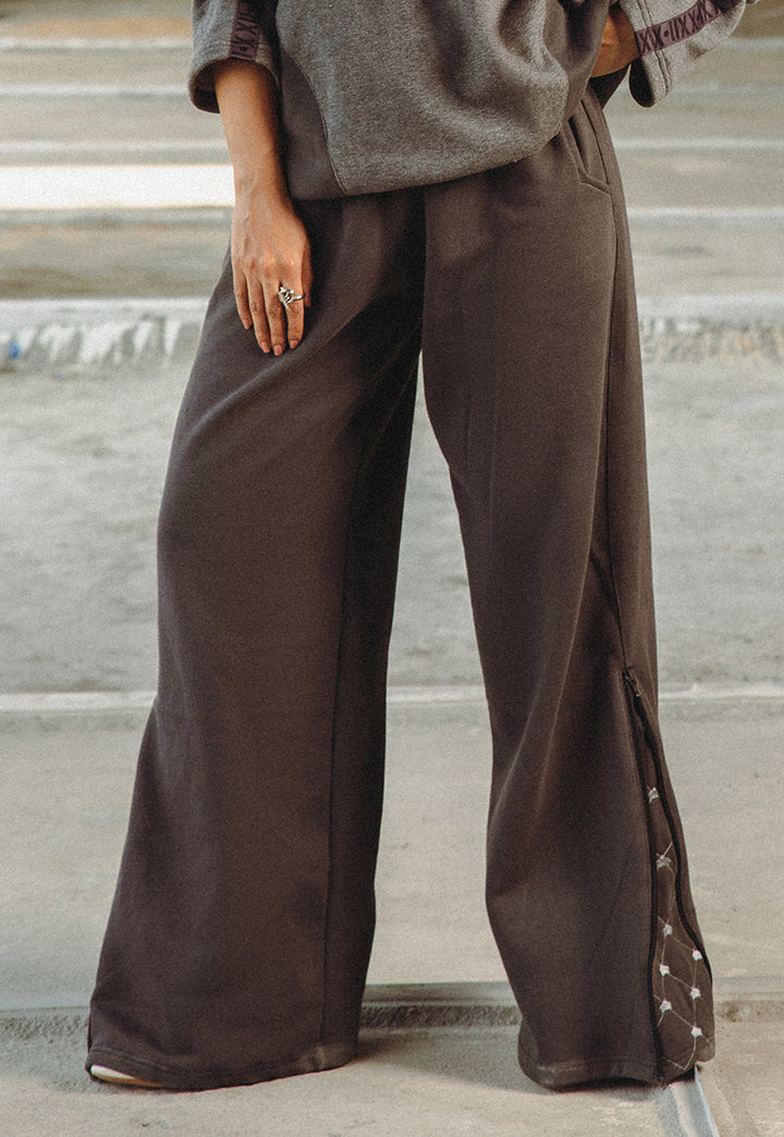 Unleash bold style with these wide-legged cotton fleece pants that seamlessly blend sophistication and comfort. The wide waistband with an inner drawstring ensures a tailored fit, while regular pockets and subtle zipper details add function with finesse. The pattern embroidery on the sides introduces a touch of opulence, making these pants the epitome of effortless luxury for a discerning wardrobe.