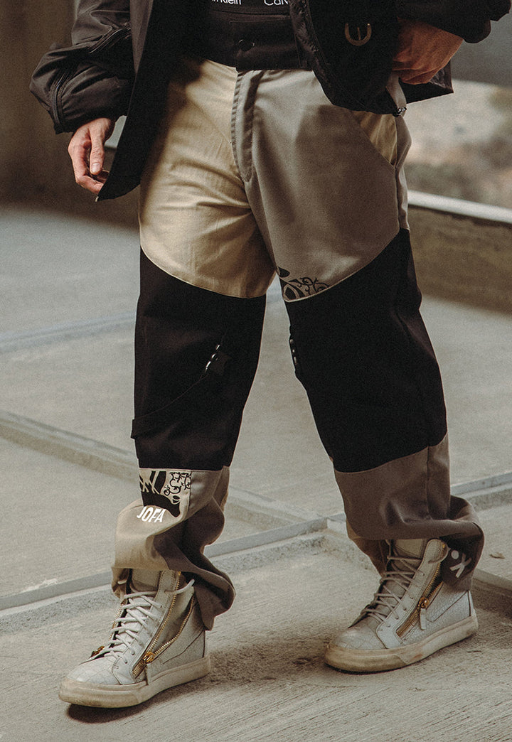 Make a lasting impression with these 3-tone cotton twill pants, a luxurious blend of structure and sophistication. Featuring iconic screen-printed branding, elevating casual luxury for a style icon. Non-functional belts add a modern edge, elevating these pants into a must-have piece for the trendsetters who demand distinction in every detail.