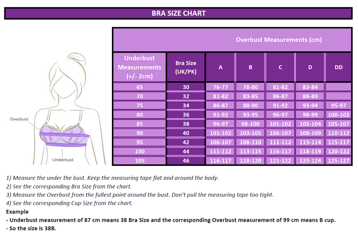 - Soft customized Jersey fabric. - Straight –Bra Band for elegant fit & support. - Non- allergic long life plastic hardware. Straps, Hooks & Eye: Adjustable and comfortable narrow straps Hook-and-eye fastener for optimum support with 2 width adjustments Fabric & Details: Non-wired bra with non-stretch padding Soft cotton fabric-lined sides for a natural push-in effect Soft jersey front, covered with body-adaptive straps Bra Cup: B