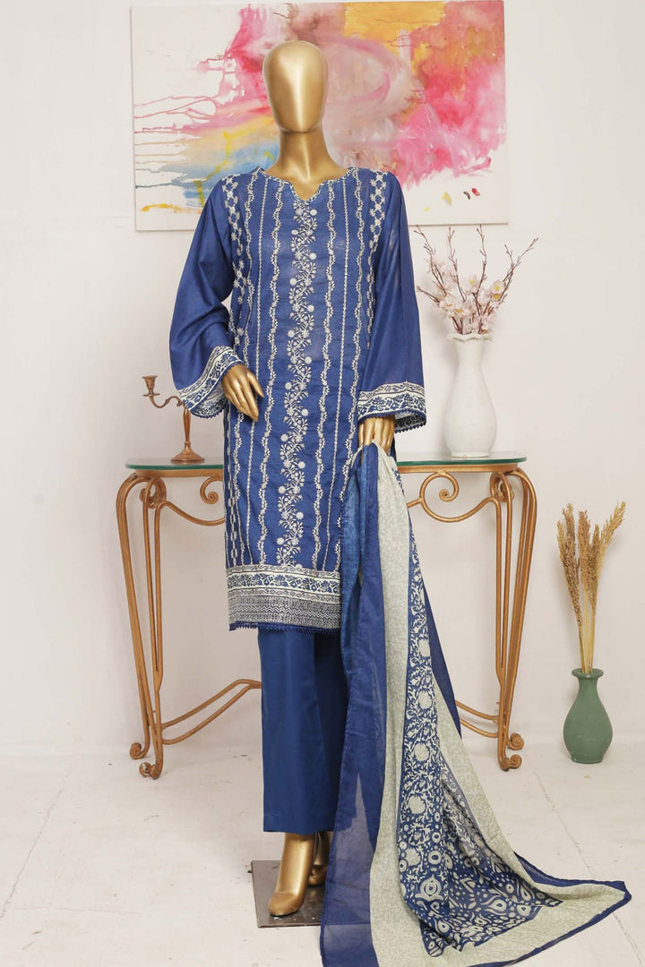 Bin Saeed Stitched 3 Piece Embroidered Lawn Collection'2023-SMLF-114-Blue