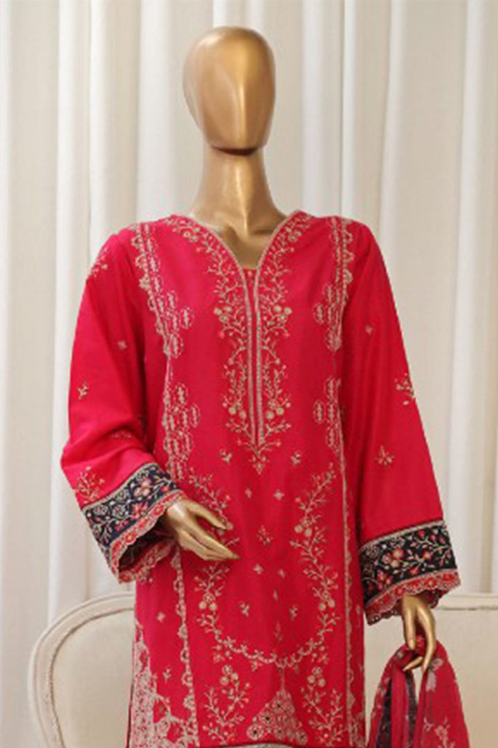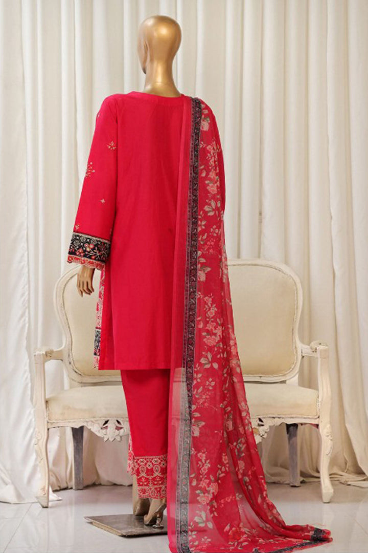 Bin Saeed Stitched 3 Piece Luxury Plain Cotton With Chiffon Dupatta Collection'2025-SMPC-1826-Red