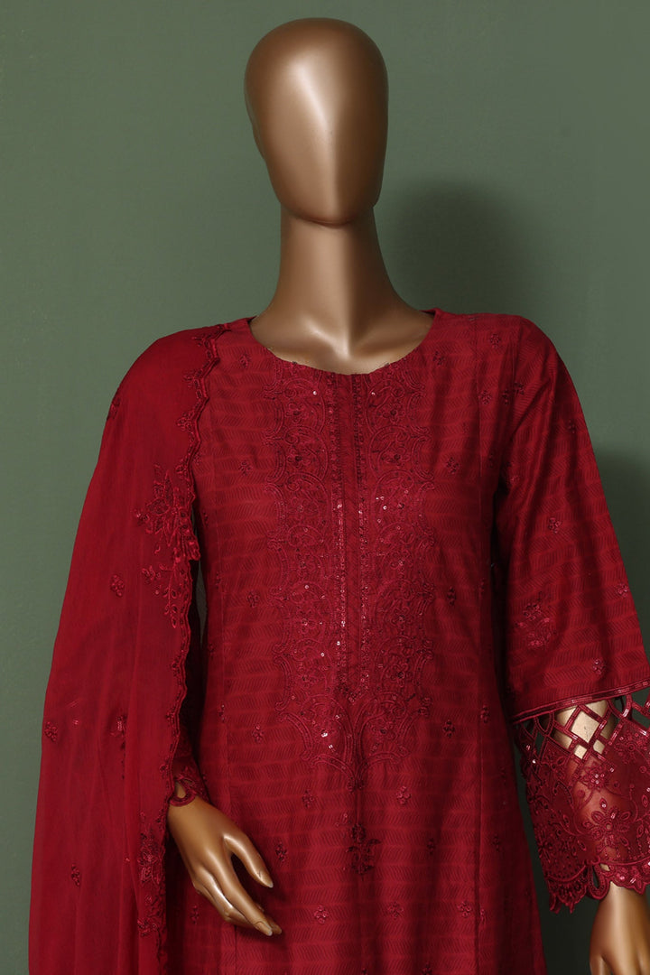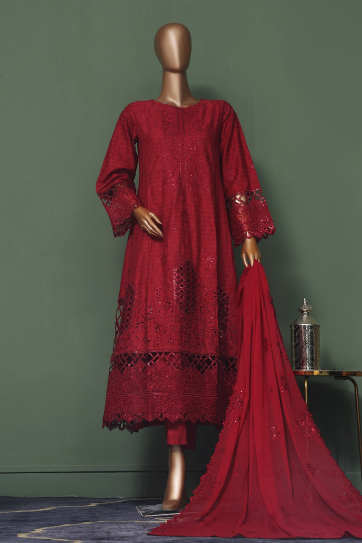 Bin Saeed Stitched 3 Piece Luxury Self Emb Cotton Frocks Collection'2024-SMK-1006-Red