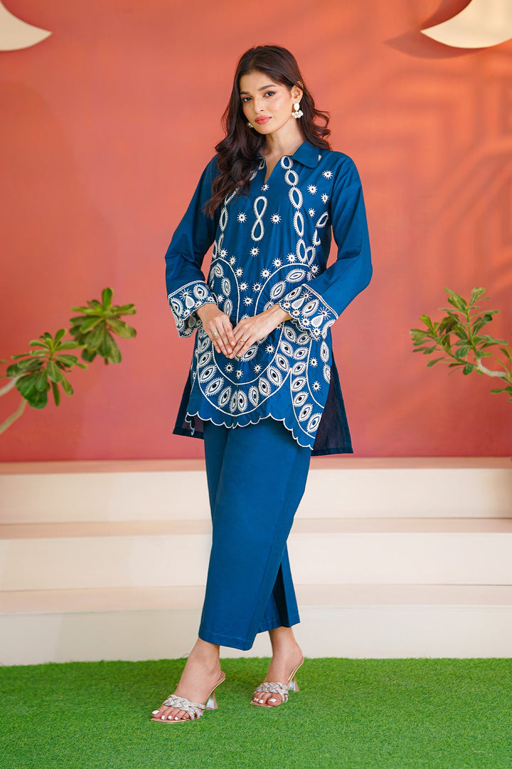 Additional Description: Crafted for the modern woman, this embroidered cotton 2-piece features a sophisticated shirt paired with effortless plazo-style bottoms. Perfect for work or weekend elegance.