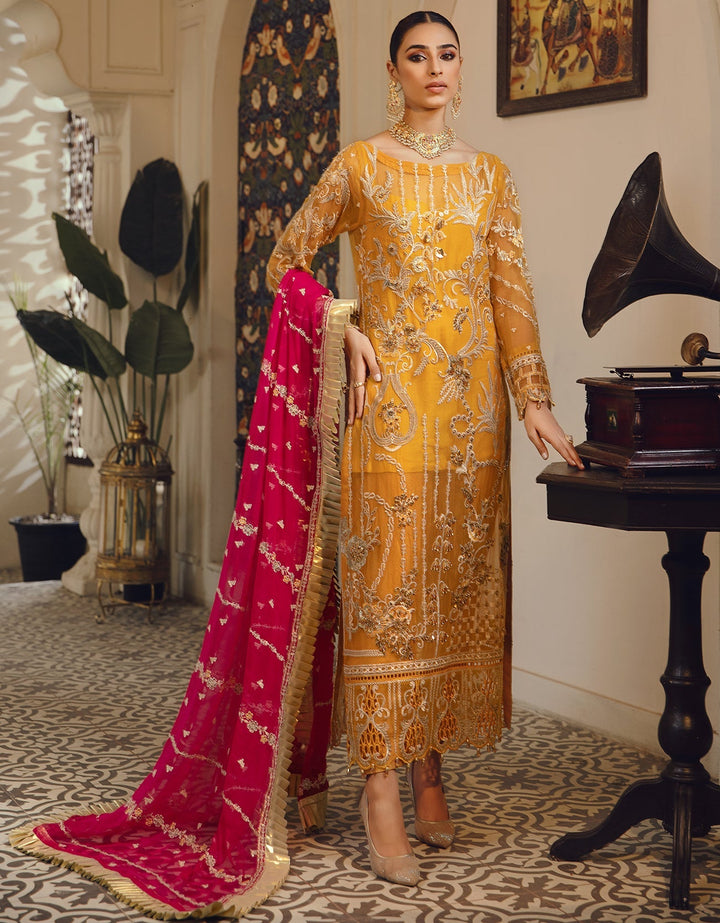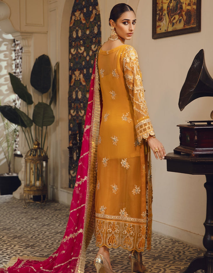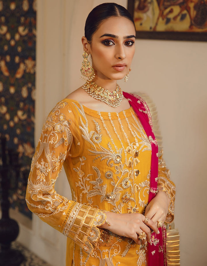 Chiffon Embroidered Hand Made Front Chiffon Embroidered Back Chiffon Embroidered Sleeves Organza Embroidered Front And Back Border Organza Embroidered Sleeves Borders Chiffon Embroidered Dupatta Dyed Raw Silk Trouser