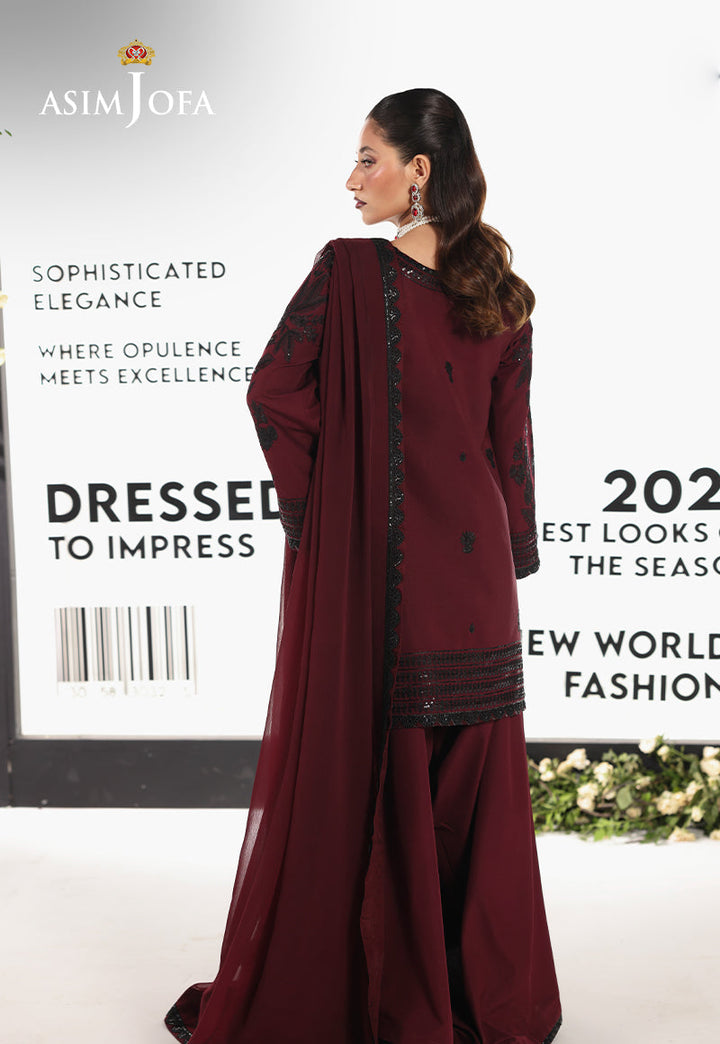 Effortlessly poised, this maroon ensemble channels understated allure with a contemporary twist. The shirt features sleek black threadwork accentuated by tonal black sequins, adding a soft shimmer and rich texture against the deep maroon base—a harmony of contrast and restraint. Paired with a flowy chiffon dupatta and matching trousers, the look is minimal yet magnetic, designed for moments where simplicity speaks volumes.