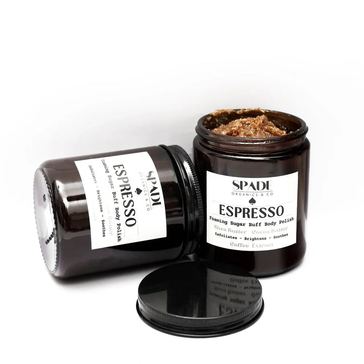 Revitalize your shower routine with our Organic Espresso body scrub. Made with nourishing ingredients such as Sugar, Shea Butter, Cocoa Butter, Coffee extract, Rose extract, Aloe Vera extract, Coffee beans, Vitamin E, Coffee hydrosol, and natural oils like Jojoba, Sweet Almond, and Sunflower. Reveal smooth, fragrant, and perfectly buffed skin.