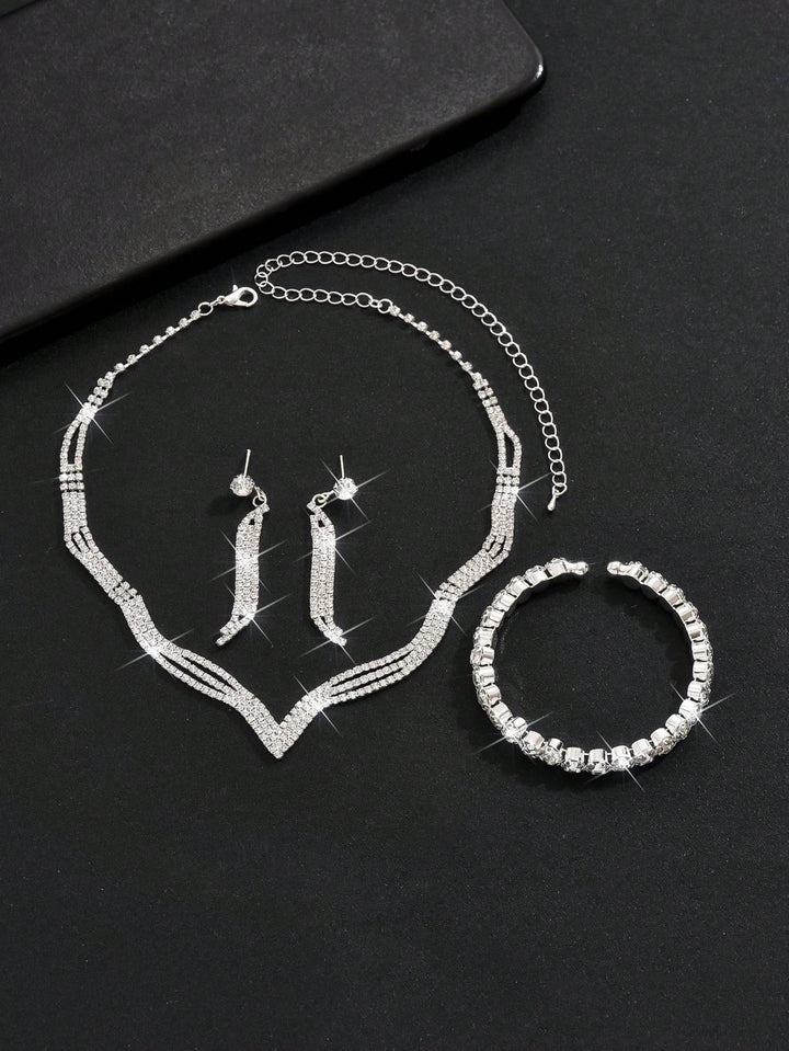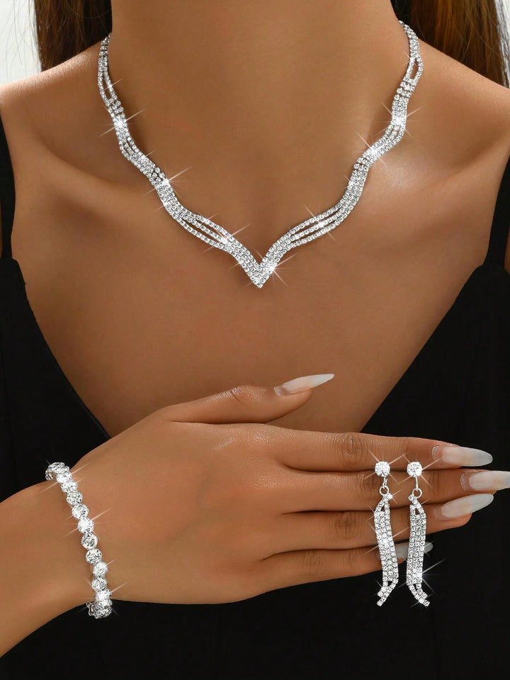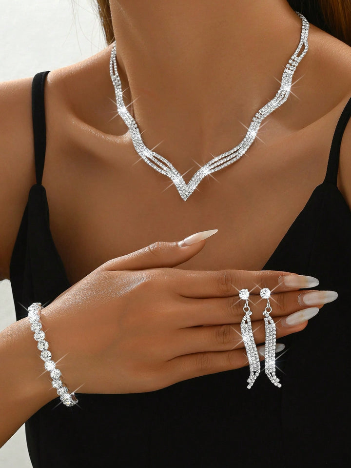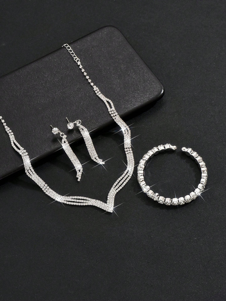 Shein - European And American Fashion Bridal Wedding Jewelry Set, Including Necklace, Earrings, Bracelet And Ring With Rhinestone For Women