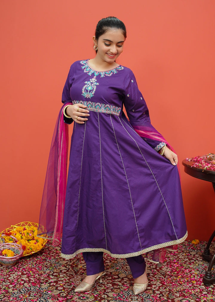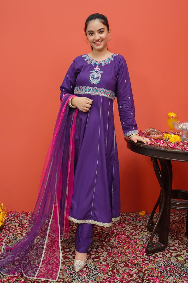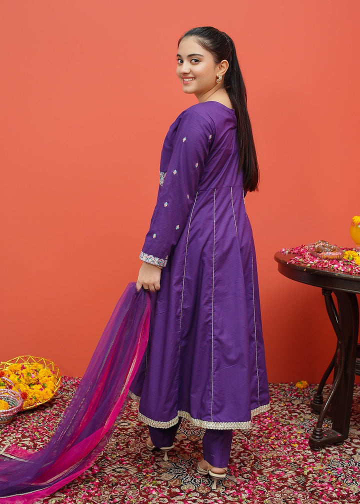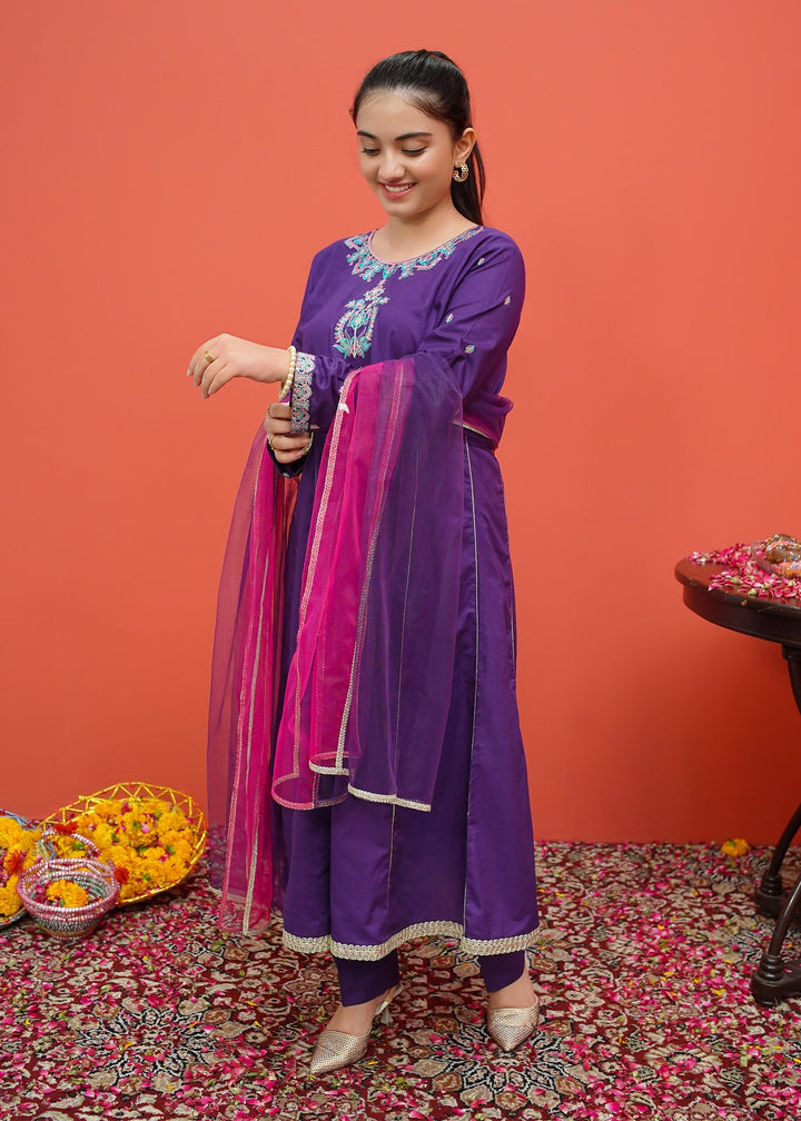 Girls' three-piece embroidered cambric purple ensemble in frock style is detailed with multicolor embroidery on the chest and sleeves and paired with a multicolor net dupatta.
