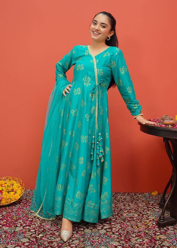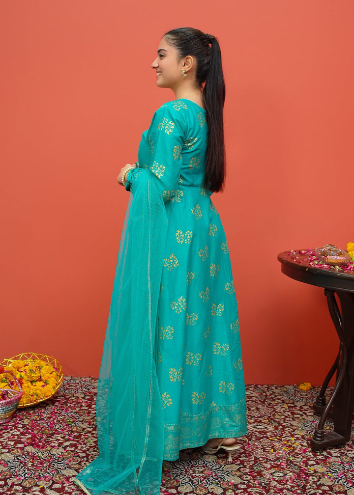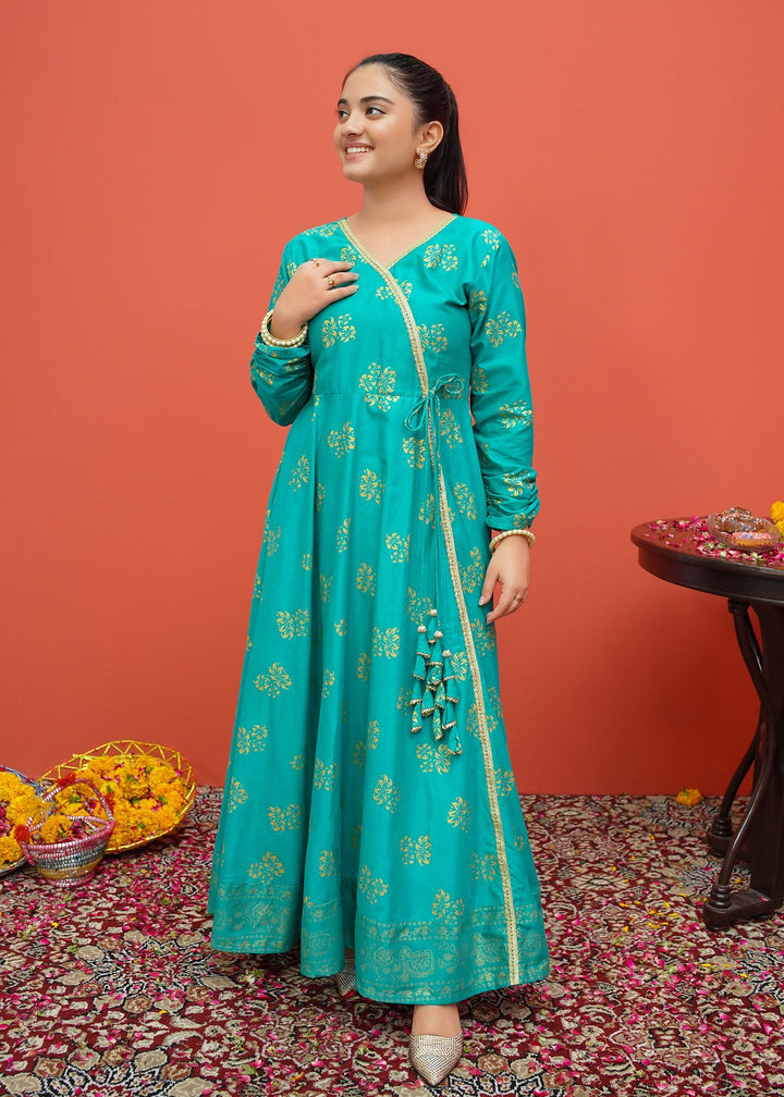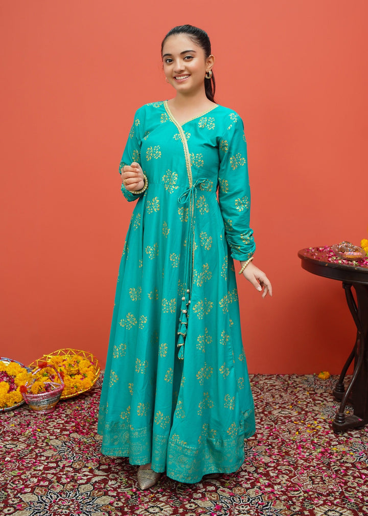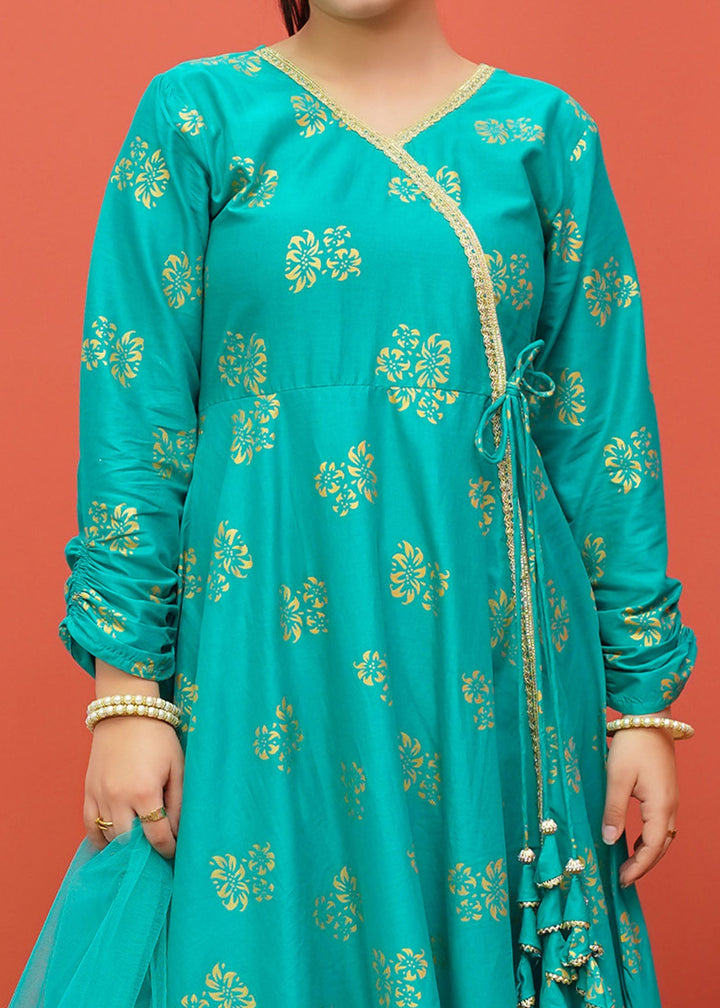 Girls' three-piece screen printed cambric green ensemble in frock style.