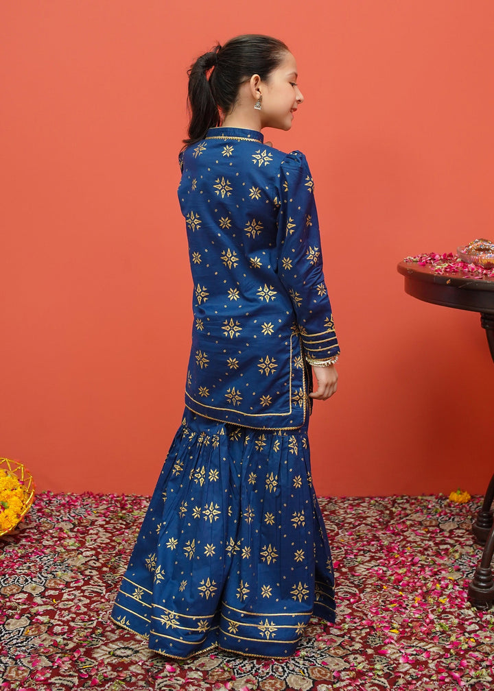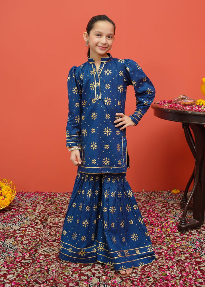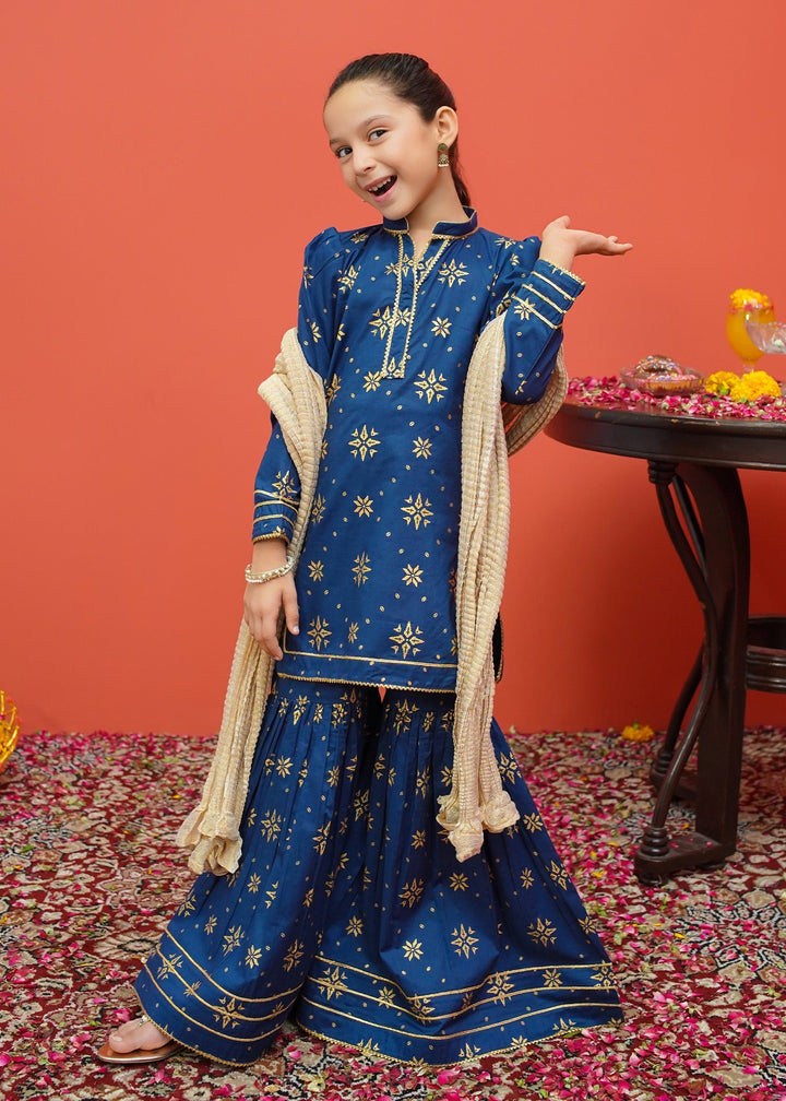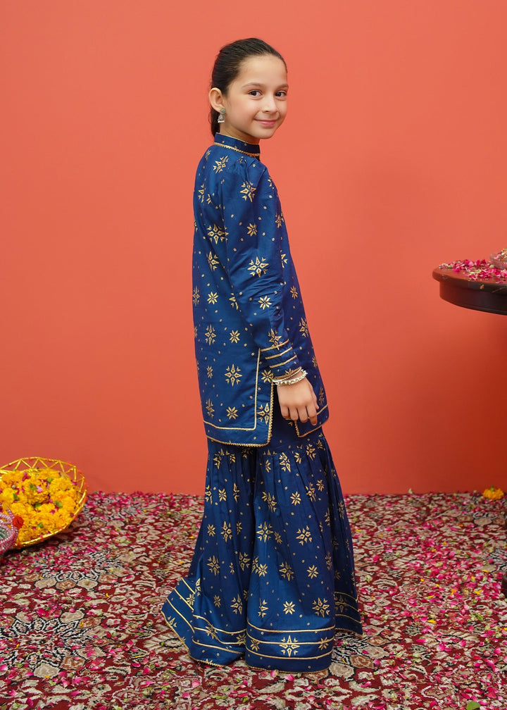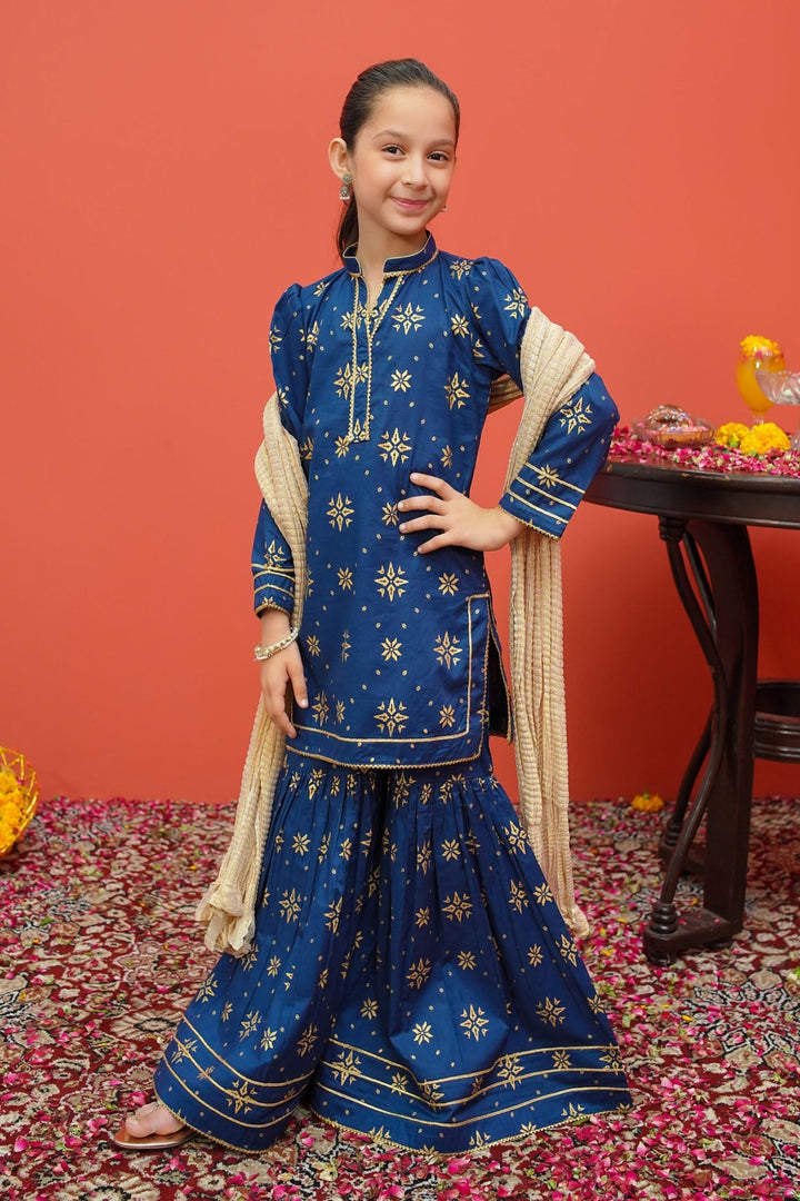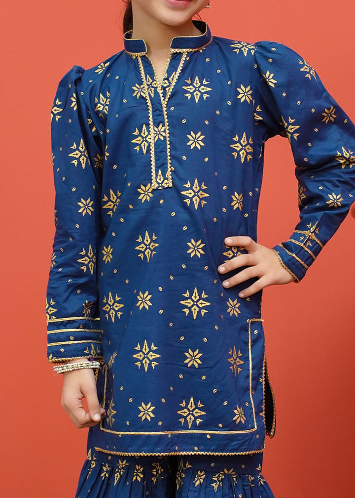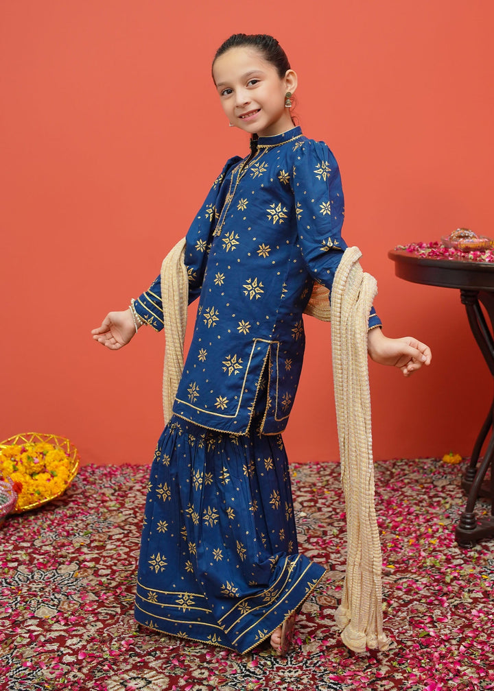 Three piece printed ensemble in frock style paired with golden crush dupatta and gharara pants.
