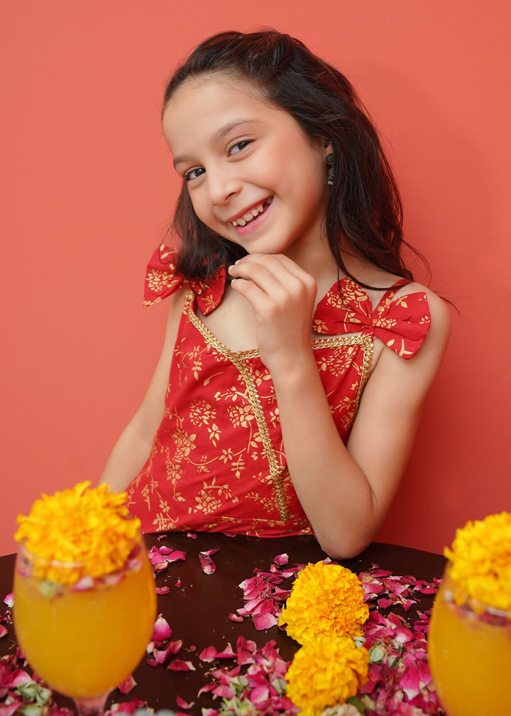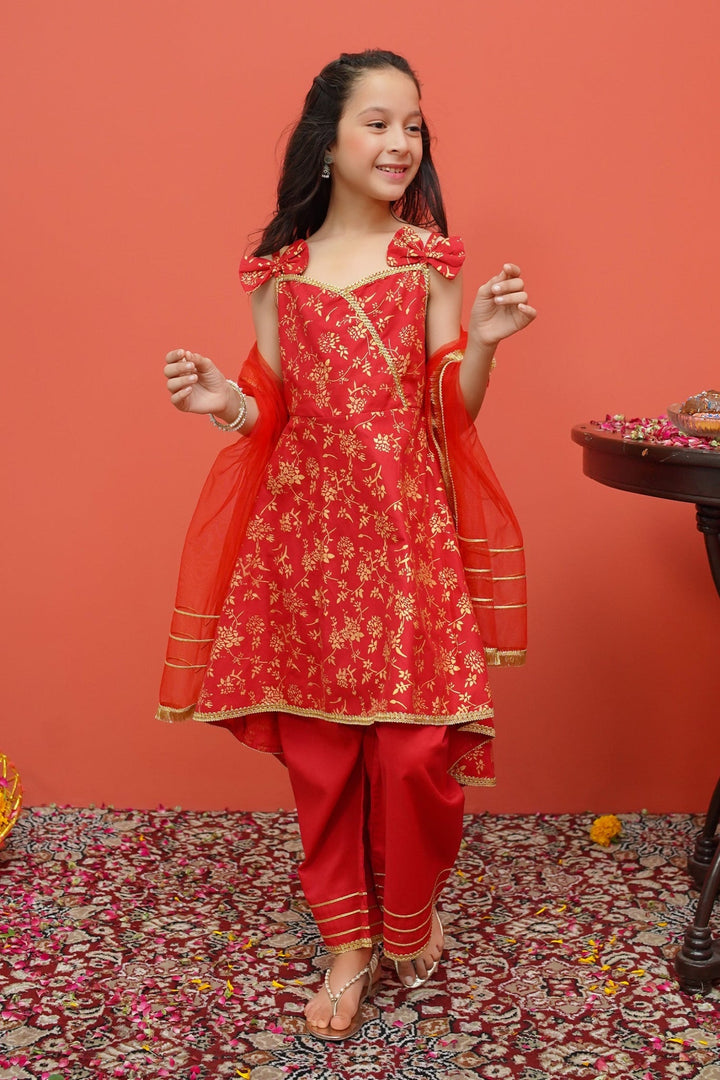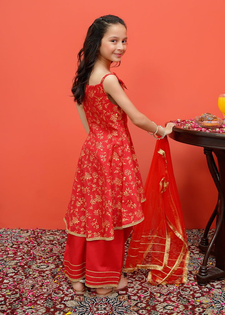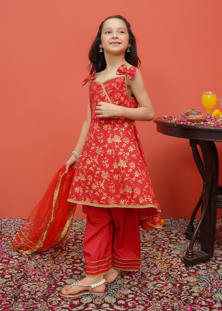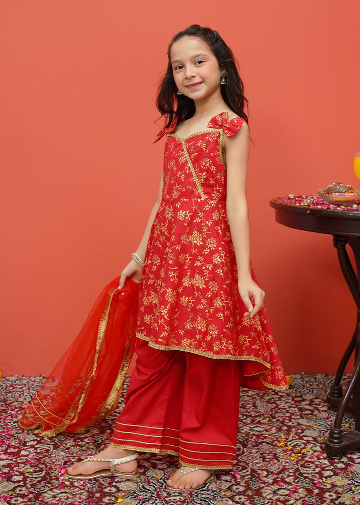Toddler Cambric Printed 3 Piece Suit - Frock style printed shirt paired with loose fit trousers and net dupatta.