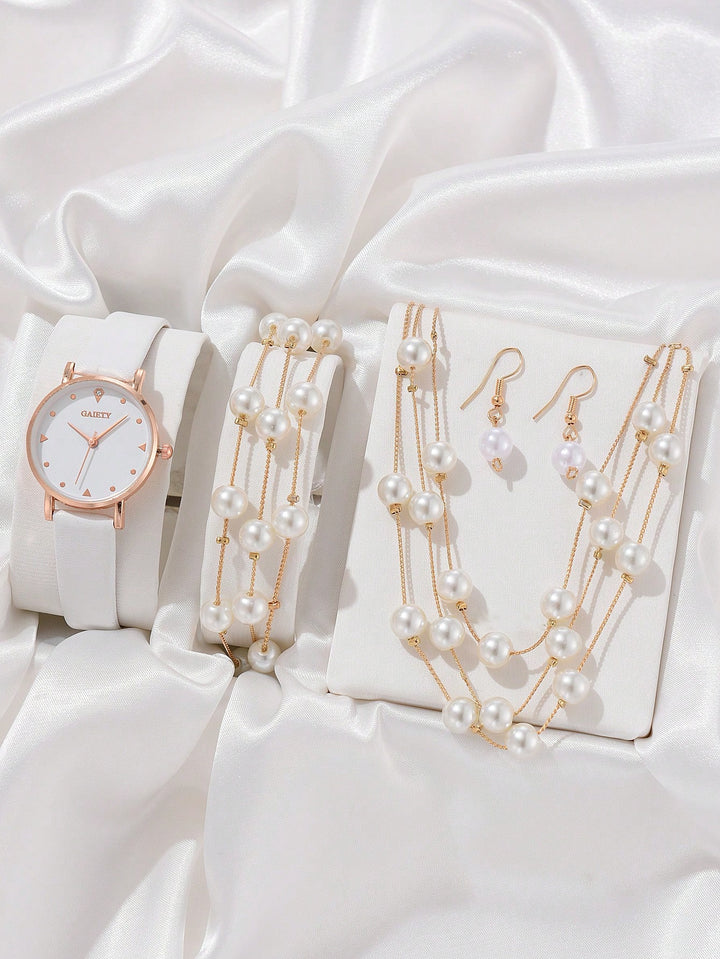 Shein - Gaiety 5pcs/set Women's Pu Leather Watch, Fashionable Business Style Alloy & Pearl Earrings, 3 Layers Pearl & Alloy Necklace Bracelet, Lady's Quartz Pearl Watch And Accessory Set