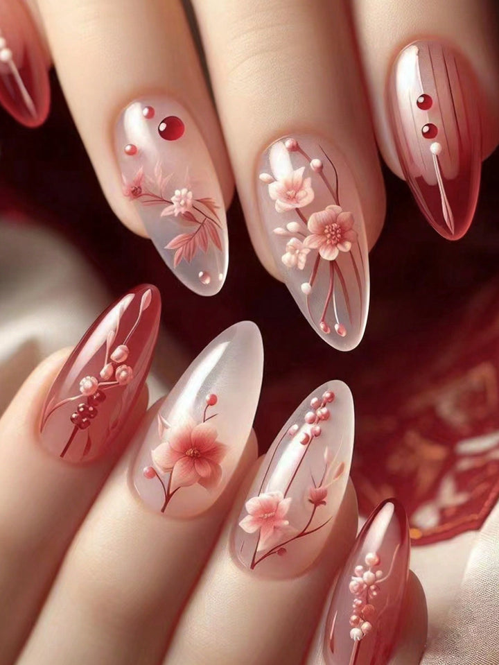Shein - Get Glamorous With, 24Pcs/Set Medium Almonds 3D Effect Flowers Press On Nails Fit Perfectly Design Fake Nails,Contain 1Pc Jelly Glue And 1Pc Nail File,Suitable For Women And Girls, Daily Life And Party Use